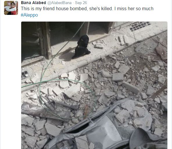 "Želim biti učiteljica, a ovaj rat ubija moje snove", tvita djevojčica čije je korisničko ime @AlabedBana. "Mrzim... Rat... Svijet nas je zaboravio. Aleppo"