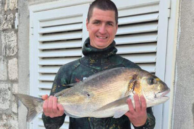 I u samom plićaku, na svega pola metra mora, riba ulazi u svjetlo i pokušava pobjeći po rubu svijetla. Slijedi brz hitac bez razmišljanja i pogađam ga! Puštam ostve jer je daleko, ne mogu ga pritisnut uz dno, ali to uopće nije ni trebalo jer je bio mrtav na mjestu…