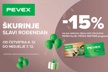 Prodajni centar PEVEX Škurinje slavi rođendan povodom kojeg časti svoje kupce s 15% popusta na sve redovne cijene uz PEVEX KLUB i PEVEX PARTNER karticu. Od četvrtka 4.12. do nedjelje 7.12. kupci osim popusta na sve redovne cijene od 15%, mogu iskoristiti i besplatnu kombi za iznos računa iznad 500…