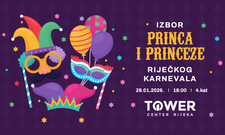 U srijedu 28. siječnja 2026., na 4. katu Tower Centra Rijeka, u 18 sati, održat će se izbor za princa i princezu Riječkog karnevala, a pobjednici će imati čast predvoditi Dječju karnevalsku povorku u Rijeci! Dođite u Tower Center Rijeka na veselu maškaranu zabavu i navijajte za vaše favorite te tako pomognite stručnom žiriju odabrati novog princa i princezu! Članovi žirija će ocjenjivati nastup, a oni su ni manje ni više nego Kraljica Riječkog karnevala, meštar Sandi i Nikola Peršić iz Koktelsa!
