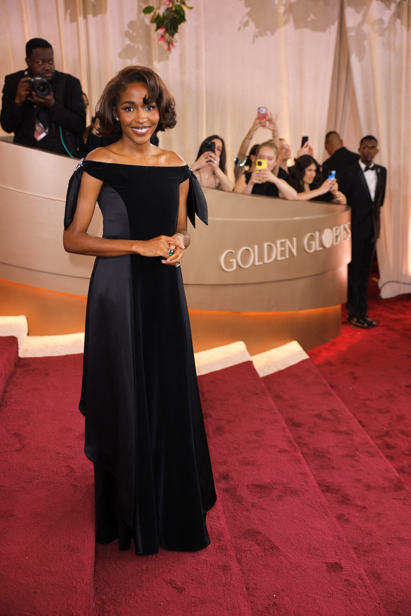 Glumica Ayo Edebir stigla je odjevena u crnu haljinu spuštenih ramena ukrašenu kristalnim detaljima koju također potpisuje Chanel.