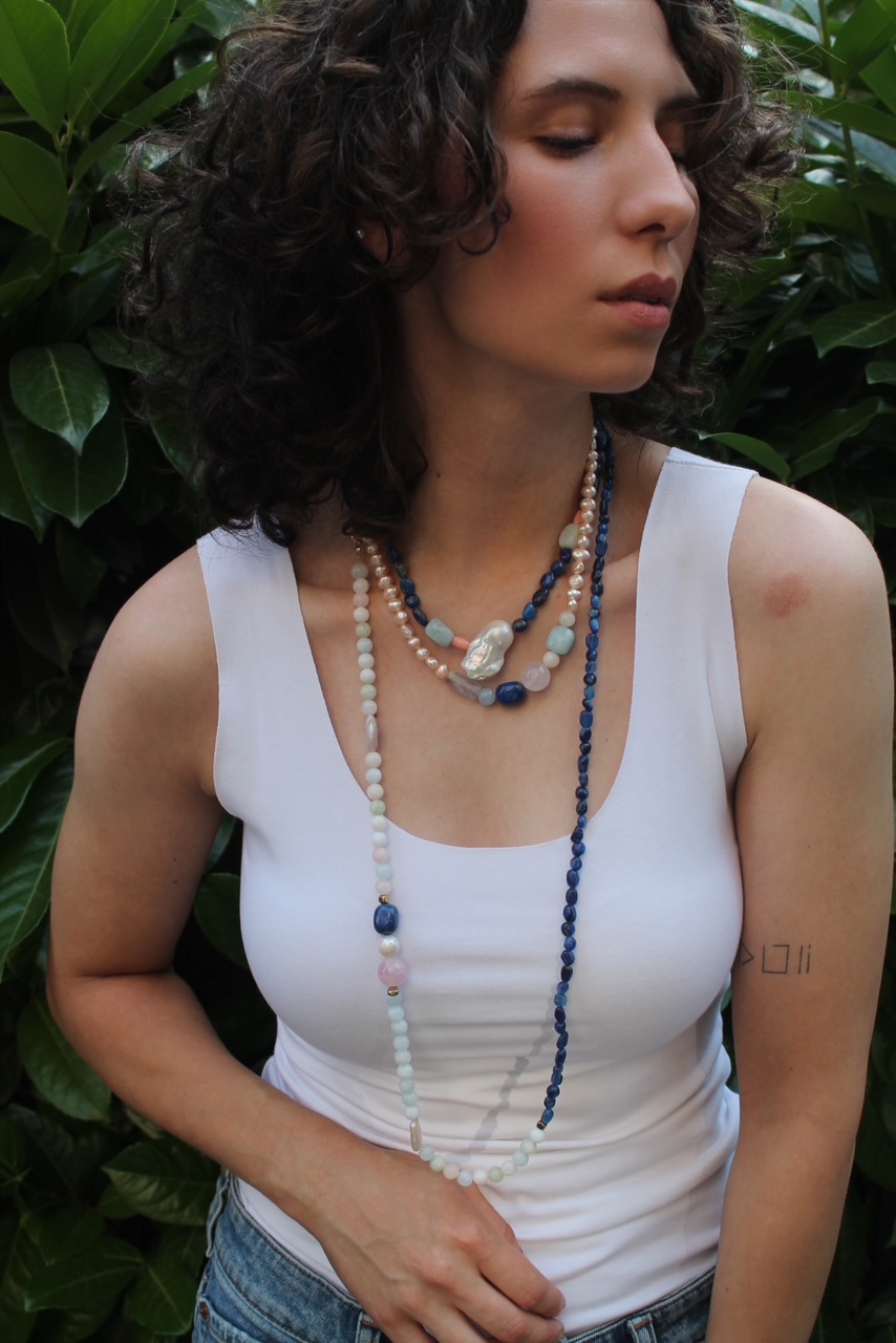 Kanaya u ponudi ima ogrlice, naušnice i narukvice, a tijekom sezone i nanogvice. Otkriva nam da najviše voli raditi s baroknim biserima i poludragim kamenjem koje kombinira s lančićima od nehrđajućeg čelika, različitih debljina i tonova, što svakom komadu daje poseban karakter.