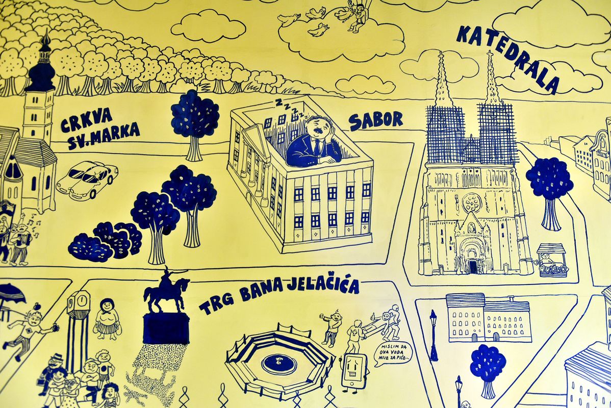 Mislav Lešić je pak nacrtao kartu centra grada, onako duhovito dakako, taman da na Trgu svetog Marka svatovi iz bijesnih »mečki« izlaze, dok u zgradi Sabora zastupnik neki, evo, drijema. Zreli smo za karaoke, ali ne bilo kakve.