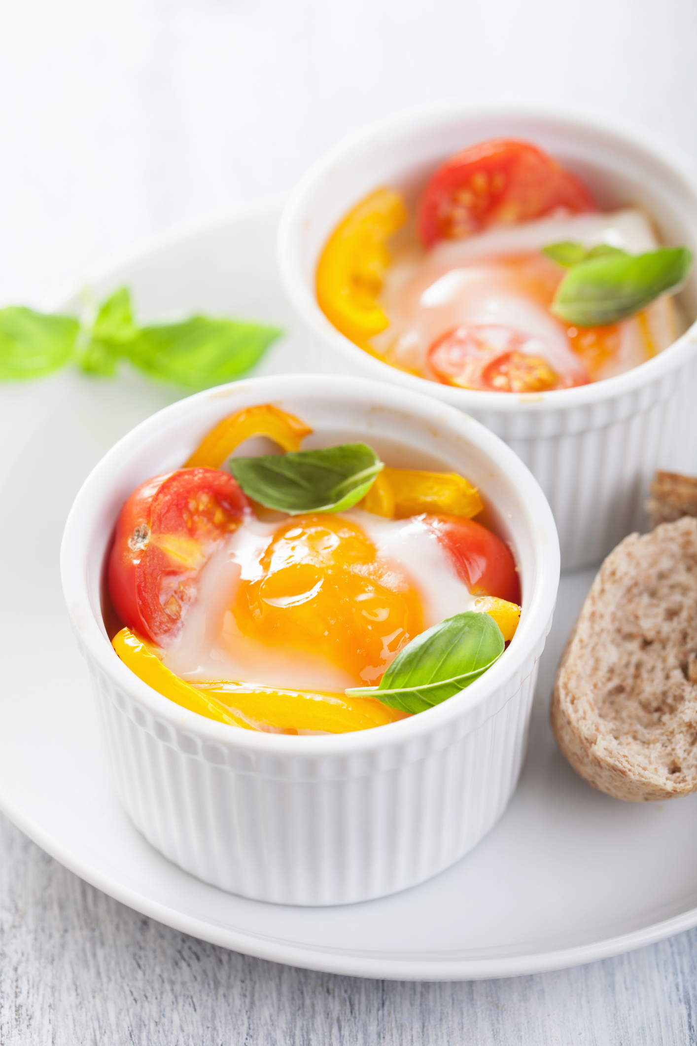Pirjane rajčice rasporedite u četiri zdjelice, u svaku zdjelicu dodajte jaje, po vrhu pospite preostalu kurkumu, sol i papar. Pecite u pripremljenoj vodenoj kupelji od 20 do 25 minuta ili dok se bjelanjci ne stvrdnu, a žumanjci ostanu još malo tekući.