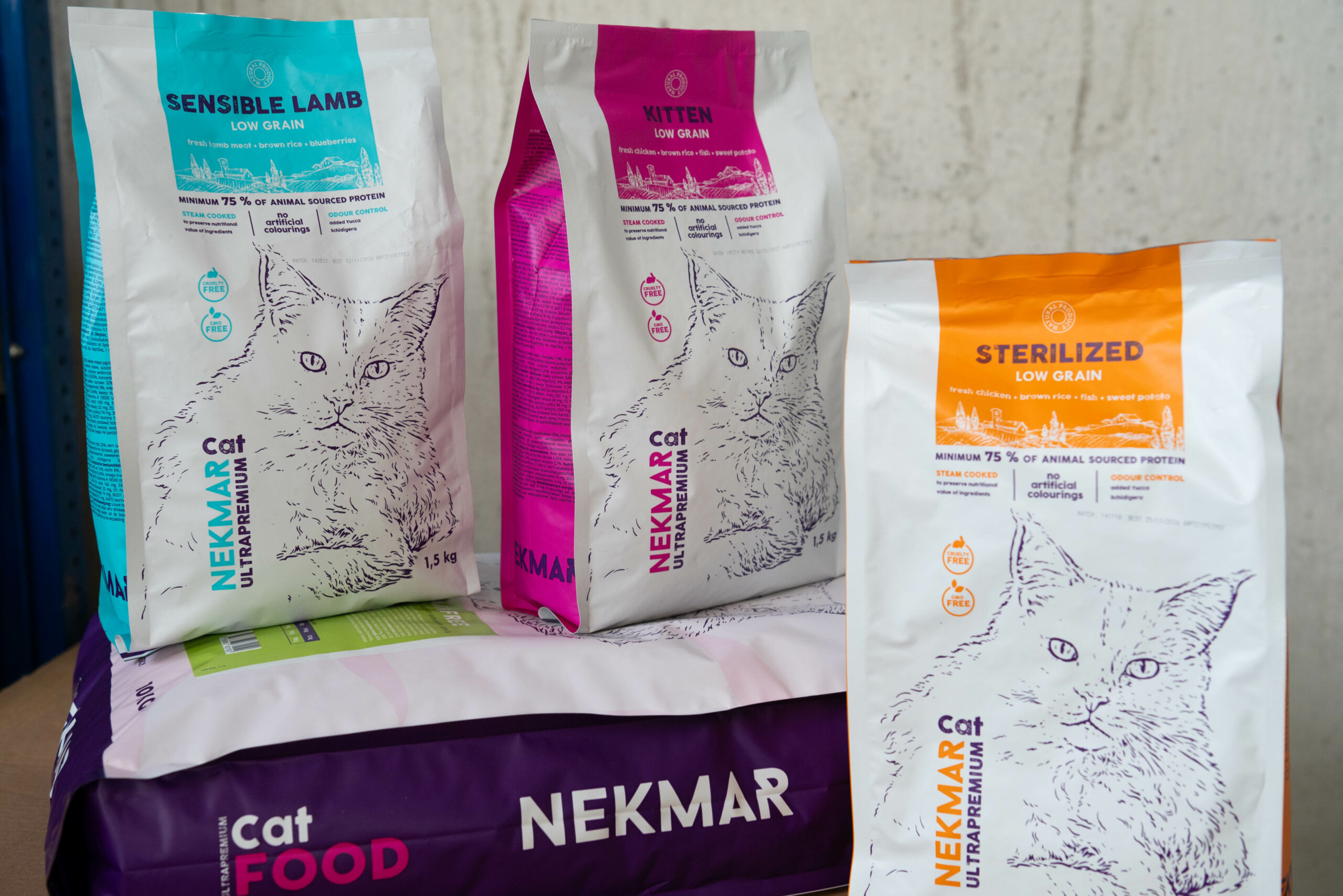 Linija za mačkeOsim hrane za pse, Nekmar ima liniju i za mačke koje će u njihovim proizvodima dobiti sve potrebne nutrijente za svoj razvoj. “Najveći izazov kod mačaka je postizanje jestivosti hrane uz pridržavanje naših postulata – bez boje i dodatnih mirisa, jer mačke jednostavno neće jesti ako im se ne hrana ne sviđa, zbog svog karaktera. U liniji hrane za mačke posežemo za mesom u visokim postotcima, jer one su mesojedi u svom iskonskom obliku te rižom u manjim postotcima, postižući tako jednaki koncept hrane i mačkama i psima. Imamo low grain, grain free, hranu za mačiće, proizvode s dodatnim vlaknima i hranu za sterilizirane mačke”, pojašnjava Marin.
