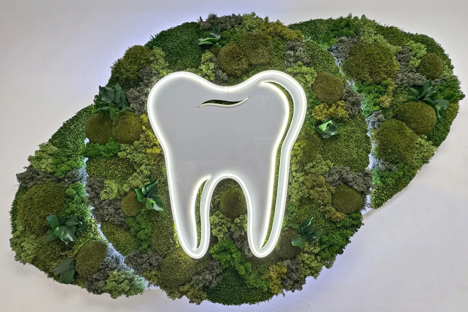 Izazov koji smo uspješno riješili u nedavnom projektu bio je zakrivljeni zid. Neravni ili zakrivljeni zidovi često su razlog zašto se klijenti odlučuju na stabilizirano zelenilo jer se, uz pažljivi odabir zelenila, paneli mogu postaviti na tzv. distancere, koji prate zakrivljenu putanju zida i uz dodatak ambijentalne rasvjete fokus uspješno prebacimo s problematičnog elementa na trodimenzionalnost zelenila.