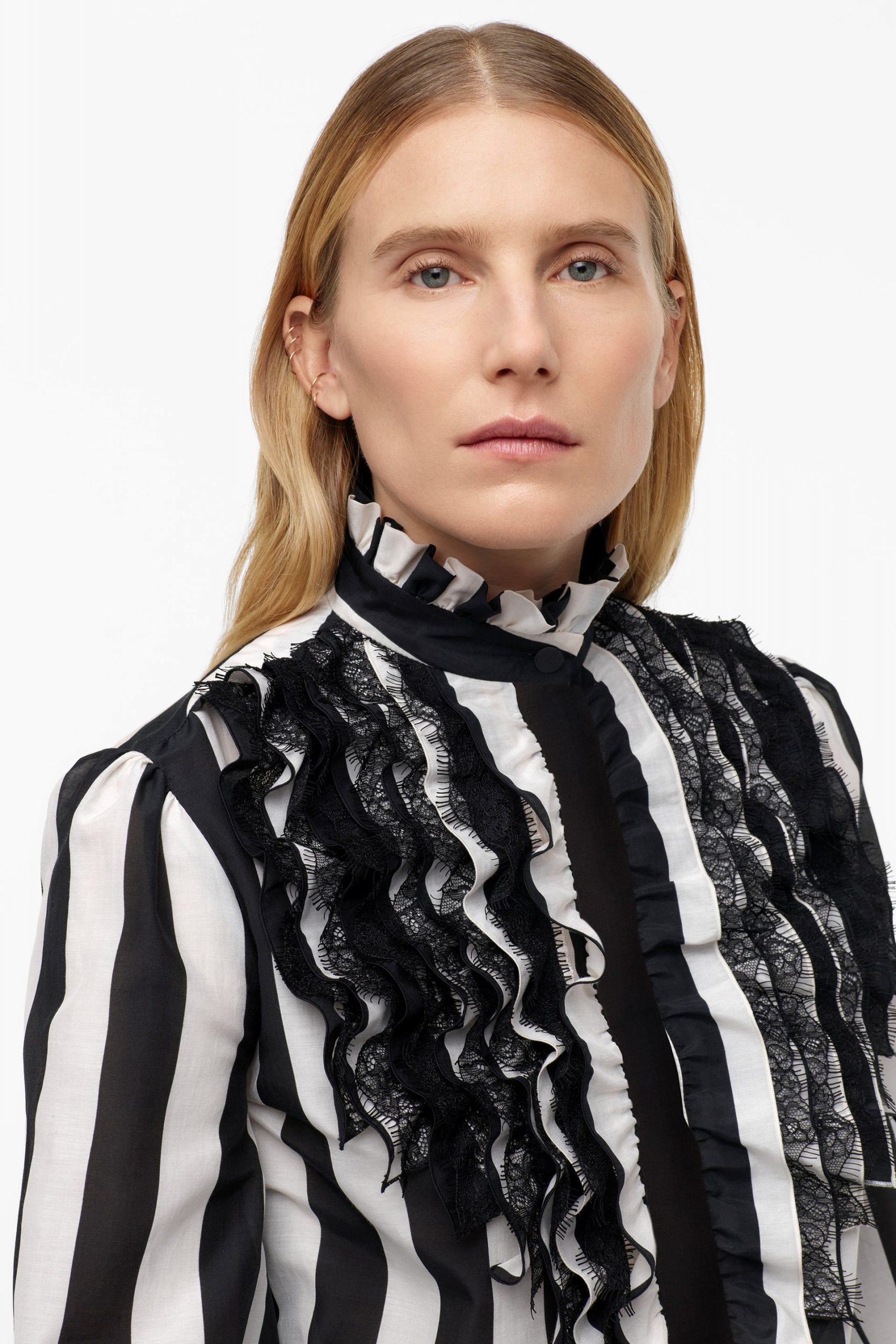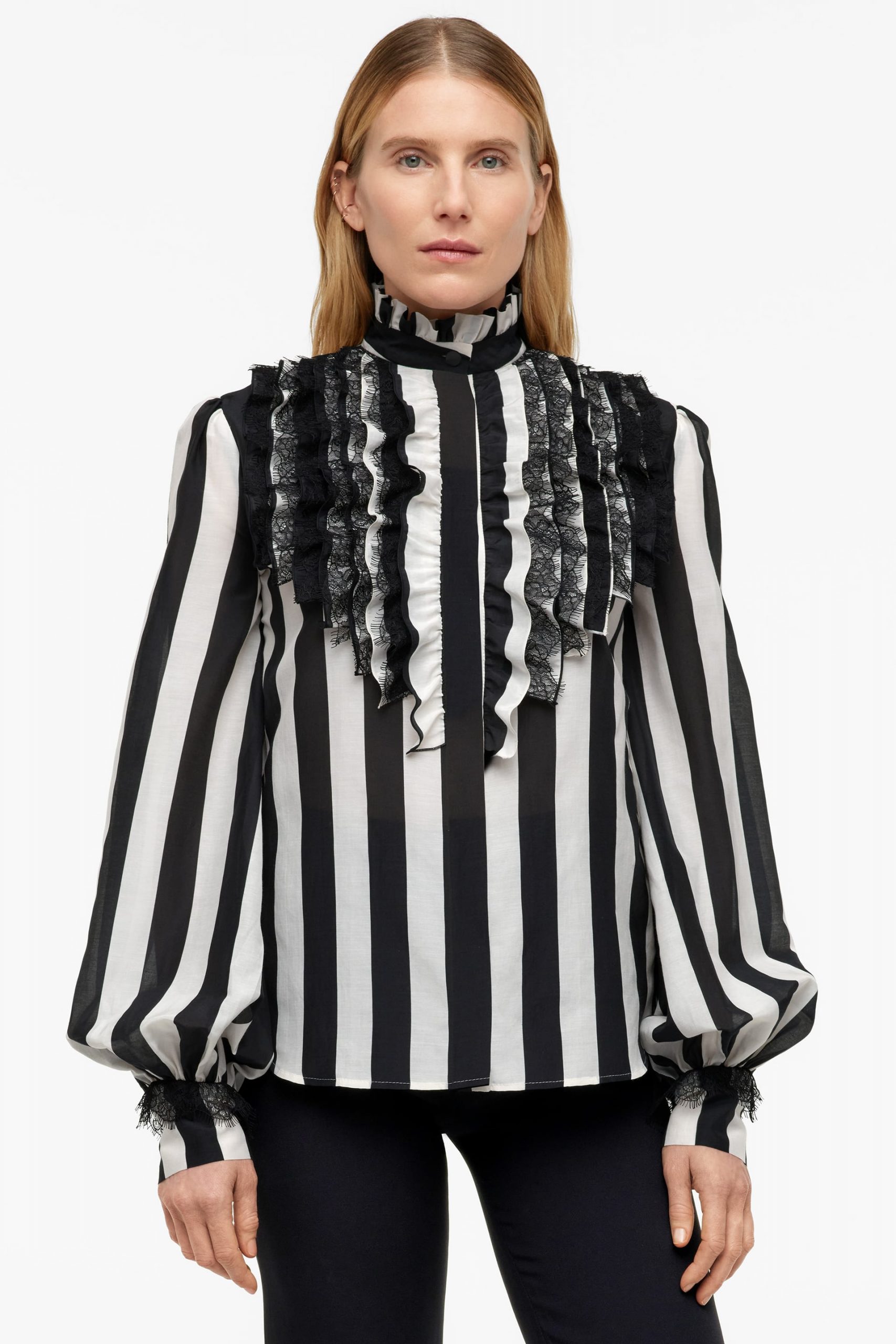 U aktualnoj ponudi modnog brenda Zara pronašli smo upravo jednu takvu košulju. Debele crno-bijele pruge same po sebi privlače poglede. No, ono što ovaj komad čini tako posebni jest ukrašena kragna u viktorijanskom stilu. Volančići, čipka i visoki ovratnik pretvaraju ovu košulju u pravi dramatični komad. Uz to su ukrašeni i rukavi.