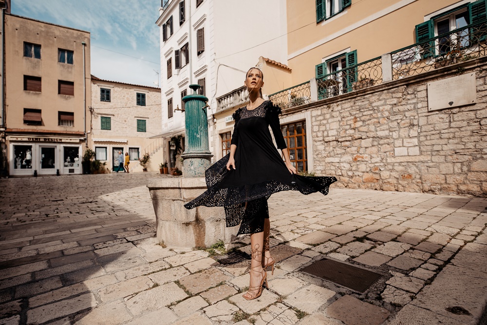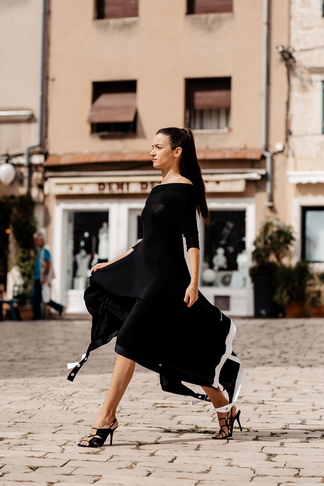 Šarmantne haljine spoj su lijepog i funkcionalnog te će svakako plijeniti pažnju. Tako će za oko lako zapasti dekonstruirana, atraktivna, crna haljina pod nazivom Valentina. Otvorena ramena asociraju na ženstvenost, a neobičan kroj mami poglede i komplimente. Model Dora, također otvorenih ramena i u crnoj boji, ističe se crnim i bijelim trakama s rinčicama koje padaju na bočnim stranama haljine, a dolazi s kraćim ili dužim rukavima. Mali odmak od crne boje predstavlja model Rosemarie, haljina izrađena od 100% pamuka koja dolazi u crnoj boji, ali i živopisnoj boji fuksije.