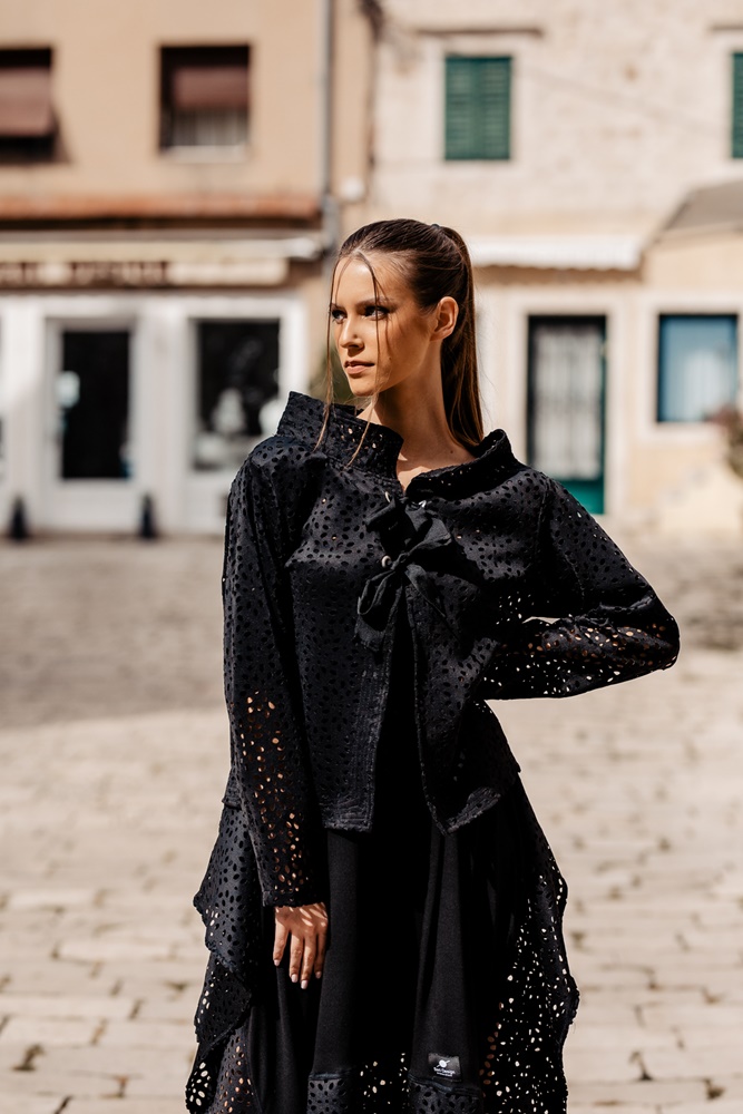 Temperamenta modna kreatorica Đina Grbin, svojom novom kolekcijom samo nastavlja uspješan niz. Kao i uvijek, najjači aduti ovog modnog brenda su odabir kvalitetnih, prirodnih materijala, autentičnost i krojevi koji prkose zubu vremena. Monokromatska kolekcija, u kojoj dominira crna, predstavlja ravnotežu i harmoniju, odnosno za cilj ima umiriti šaren, prpošan i nerijetko kaotičan svijet oko nas. Svaka žena, bez obzira na dob ili konstituciju tijela, osjećat će se posebno u elegantnim krojevima, koji laskaju svim siluetama.