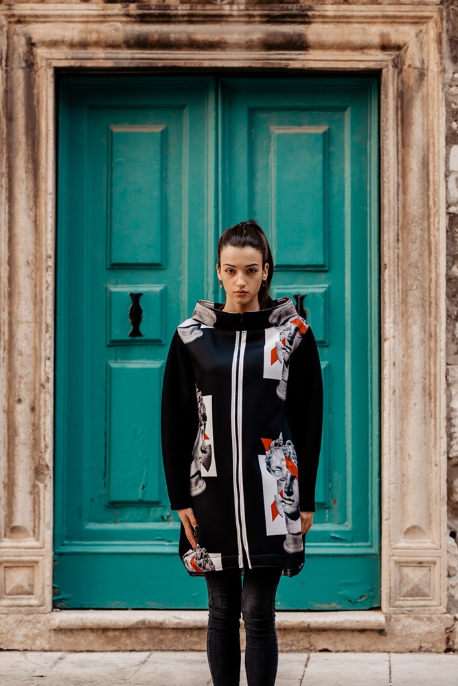 Jedan od najzanimljivijih i najupečatljivijh komada svakako je i kaput Vita – David. Razigran, urban, moderan i pomalo ekscentričan prepoznatljiv je po printu antičkih statua zbog kojih će ovaj kaput skretati pozornost.