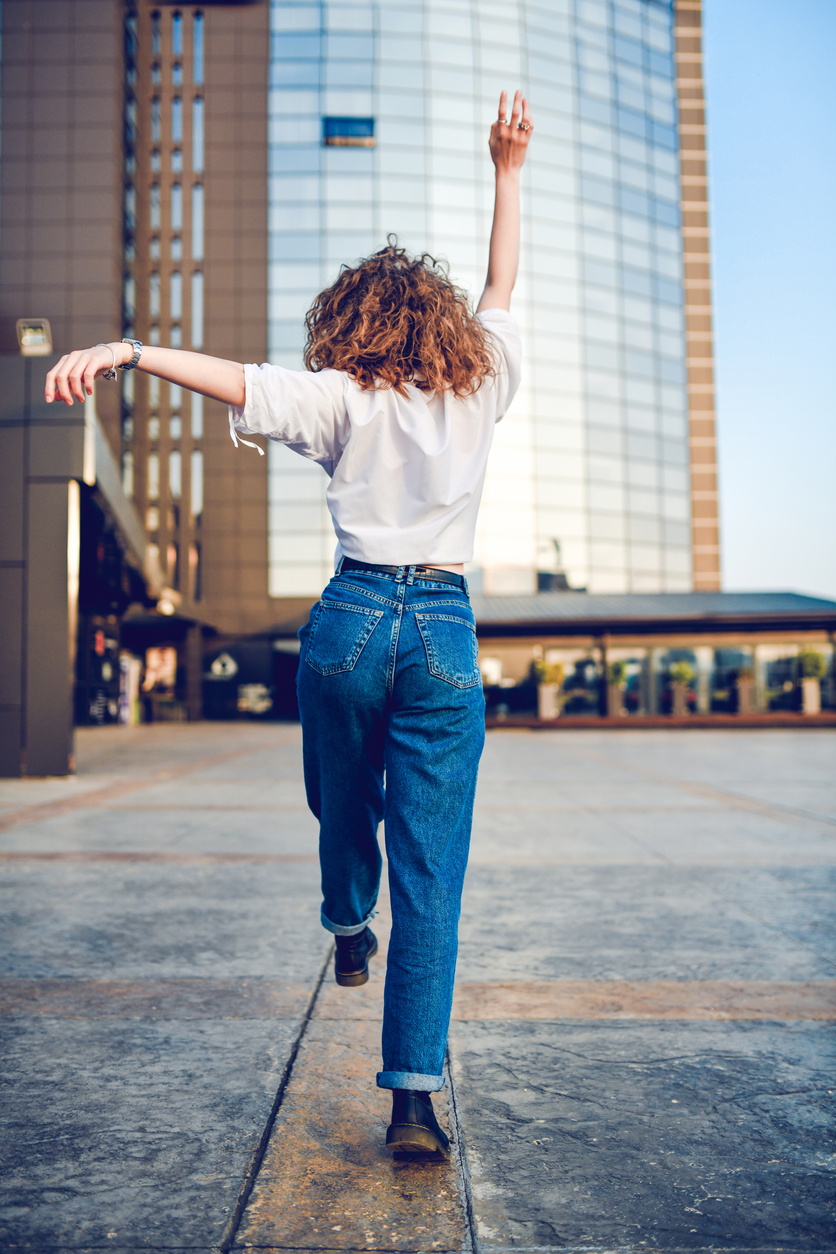 Visina struka također je važna. Traperice s visokim strukom vizualno izdužuju noge naglašavajući prirodnu liniju struka. Osim toga, takav kroj lijepo oblikuje figuru i stvara uravnotežen omjer između donjeg i gornjeg dijela tijela.