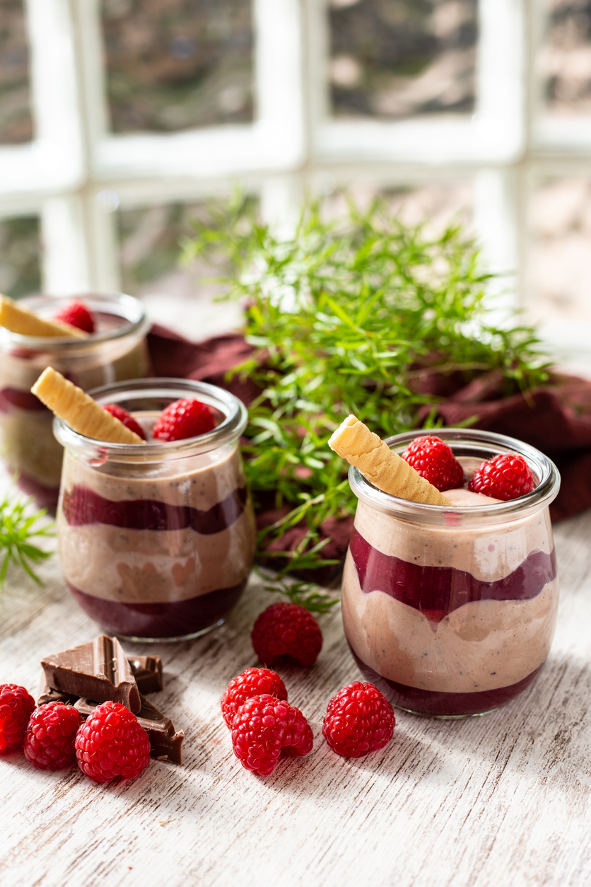 Čokoladnu smjesu raspodijeliti u 6 čaša. Po vrhu ravnomjerno rasporediti razrijeđeni džem. Ohladiti nepokriveno u hladnjaku oko 45 minuta, dok se mousse ne stegne. (Može se čuvati pokriven u hladnjaku do 3 dana.)