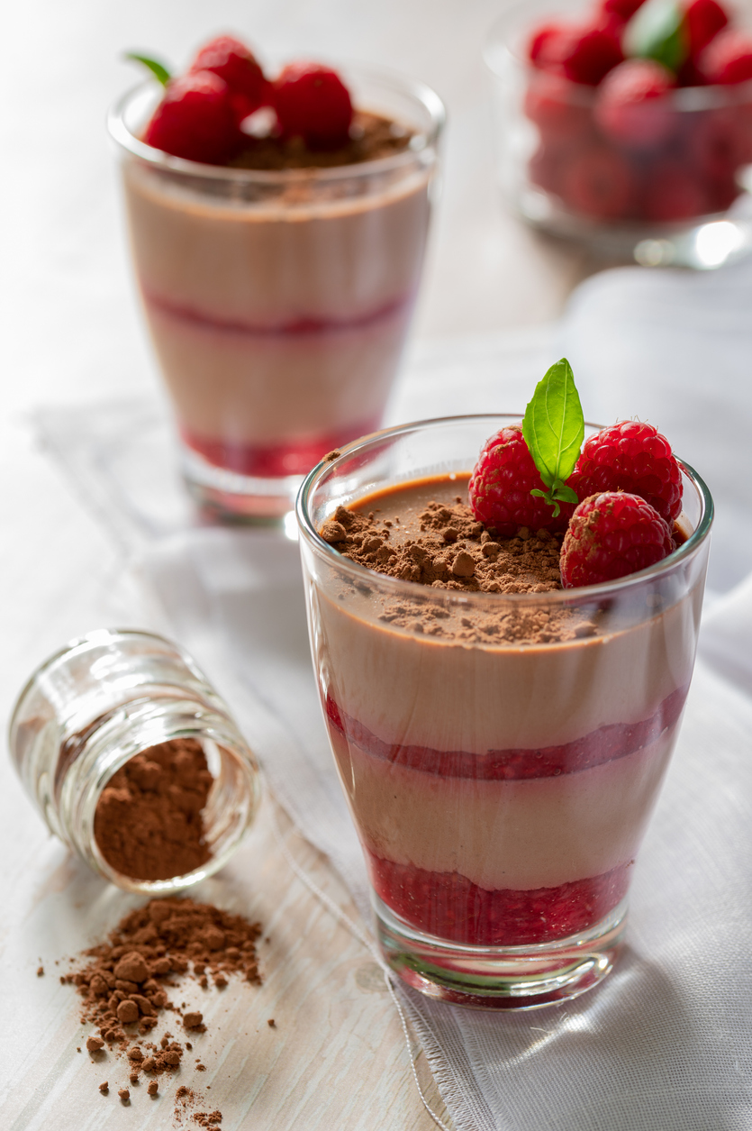 Neposredno prije posluživanja istući preostalih 120 ml vrhnja s ¼ čajne žličice vanilije i ⅛ čajne žličice ekstrakta badema do srednje čvrstih vrhova. Žlicom nanijeti na mousse. Ukrasiti svježim malinama i lagano posuti kakaom.