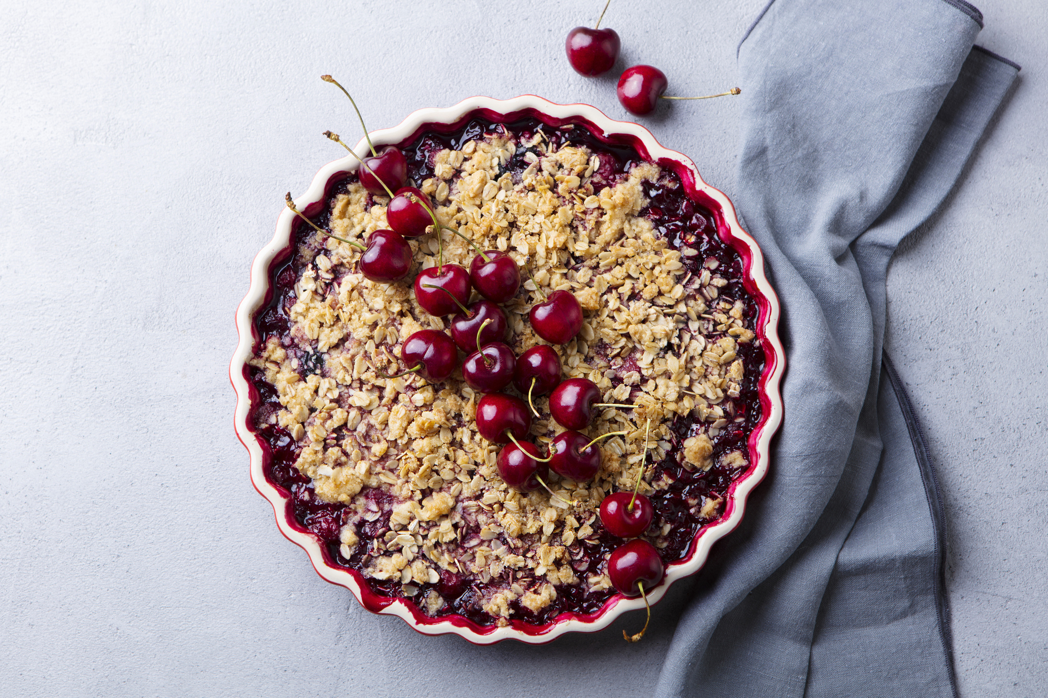 PRIPREMA: Za početak pripremiti smjesu za crumble. U posudi pomiješati brašno, 80 g šećera, fino mljevene bademe i prstohvat soli, zatim dodati maslac narezan na kockice. Izraditi mrvičastu smjesu. Smjesu pokriti prianjajućom folijom i staviti u hladnjak dok pripremite trešnje.