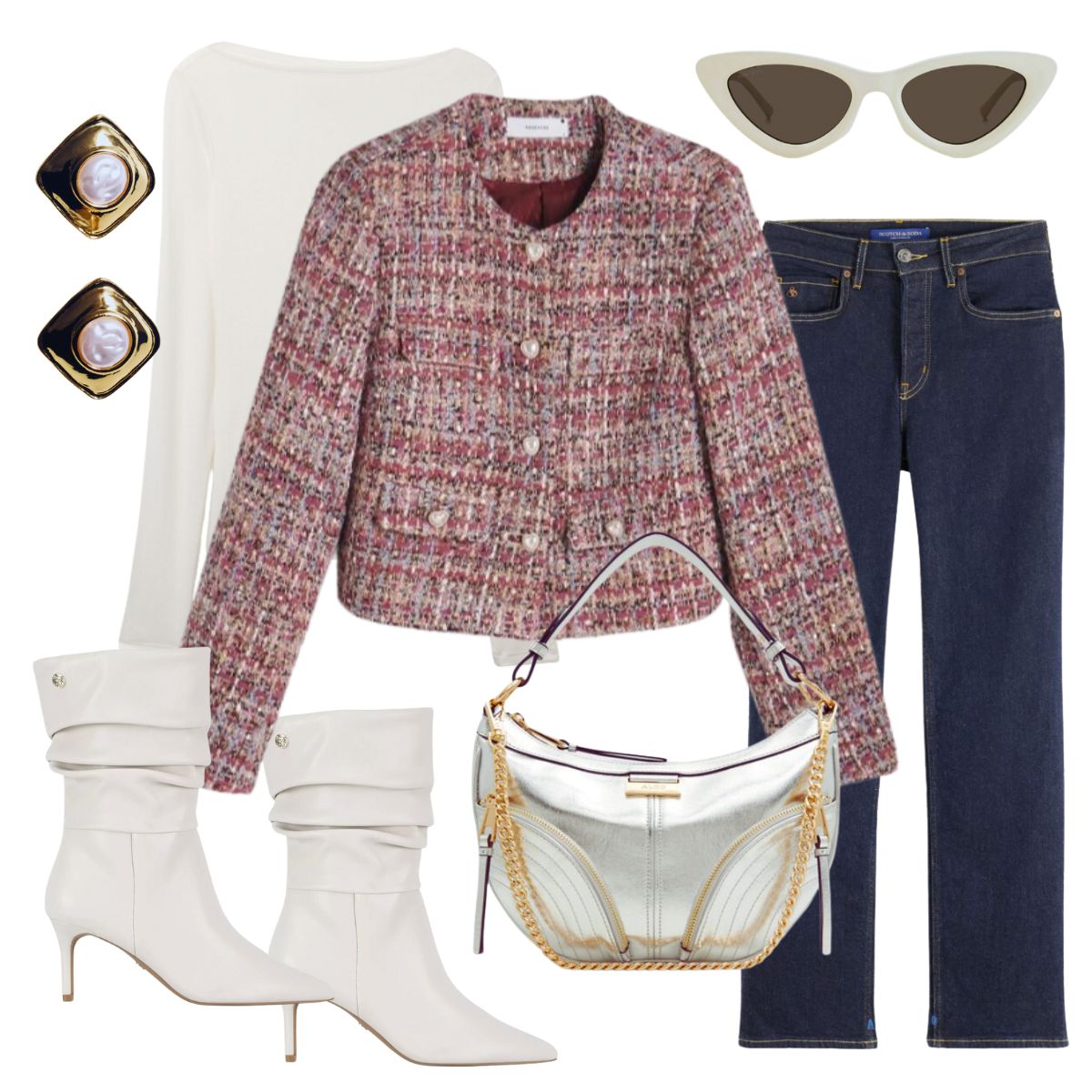 Glavni komad u ovoj kombinaciji je sako od tvida u ružičastim i bež tonovima. Tvid u priču donosi klasičan, pomalo vintage dodir, te leži na ivici između formalnog i opuštenog stila. Odličan je za kombiniranje s trapericama ili elegantnim hlačama, stvarajući sofisticiran izgled koji je i dalje ugodan i pristupačan.