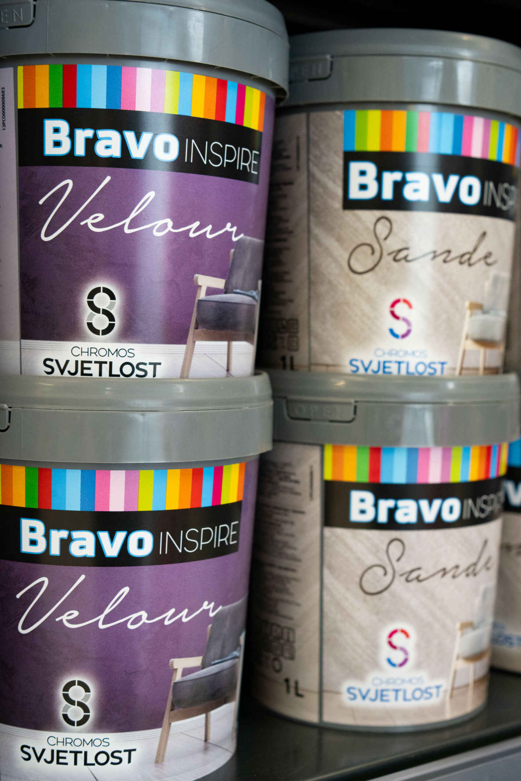Bravo INSPIRE linija pruža visokokvalitetan dekorativni završni premaz za unutarnje zidove izrađene od kvalitetnog polimernog veziva i pigmenata kojima se postižu dekorativni efekti. Bravo INSPIRE Elite pruža jedinstveni efekt elegancije, Velour na zidu pruža jedinstveni efekt baršuna, a Sande jedinstveni efekt pijeska.