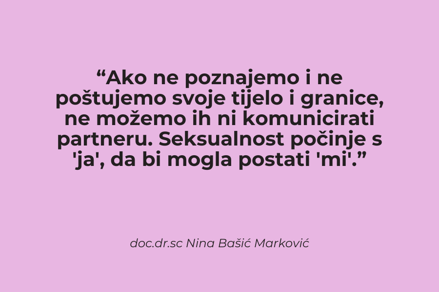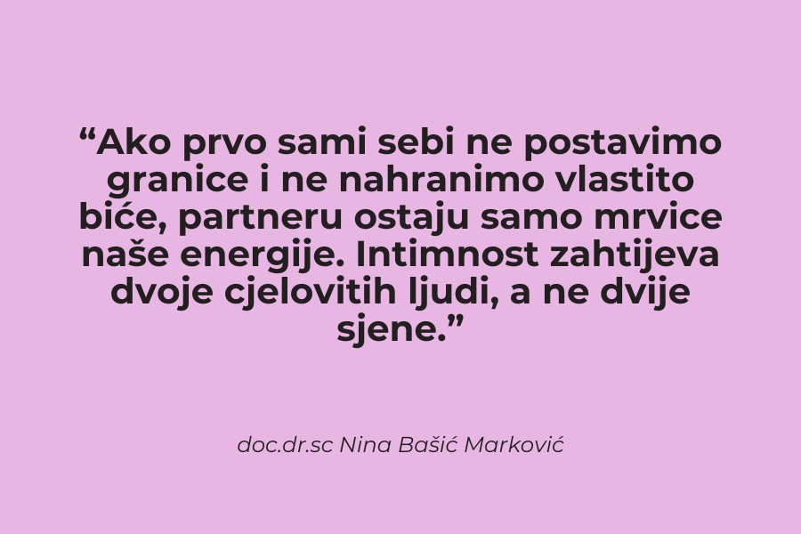 – To je ključno. Ljubav i intimnost ne počinju u odnosu s drugom osobom, nego u odnosu prema sebi. Ako osoba stalno ignorira vlastite granice, umor i potrebe, tijelo će prije ili kasnije ‘ugasiti’ želju. Seksualnost ne može cvjetati u iscrpljenosti i samoponištavanju. Ako ne poznajemo i ne poštujemo svoje tijelo i granice, ne možemo ih ni komunicirati partneru. Seksualnost počinje s ‘ja’, da bi mogla postati ‘mi’.