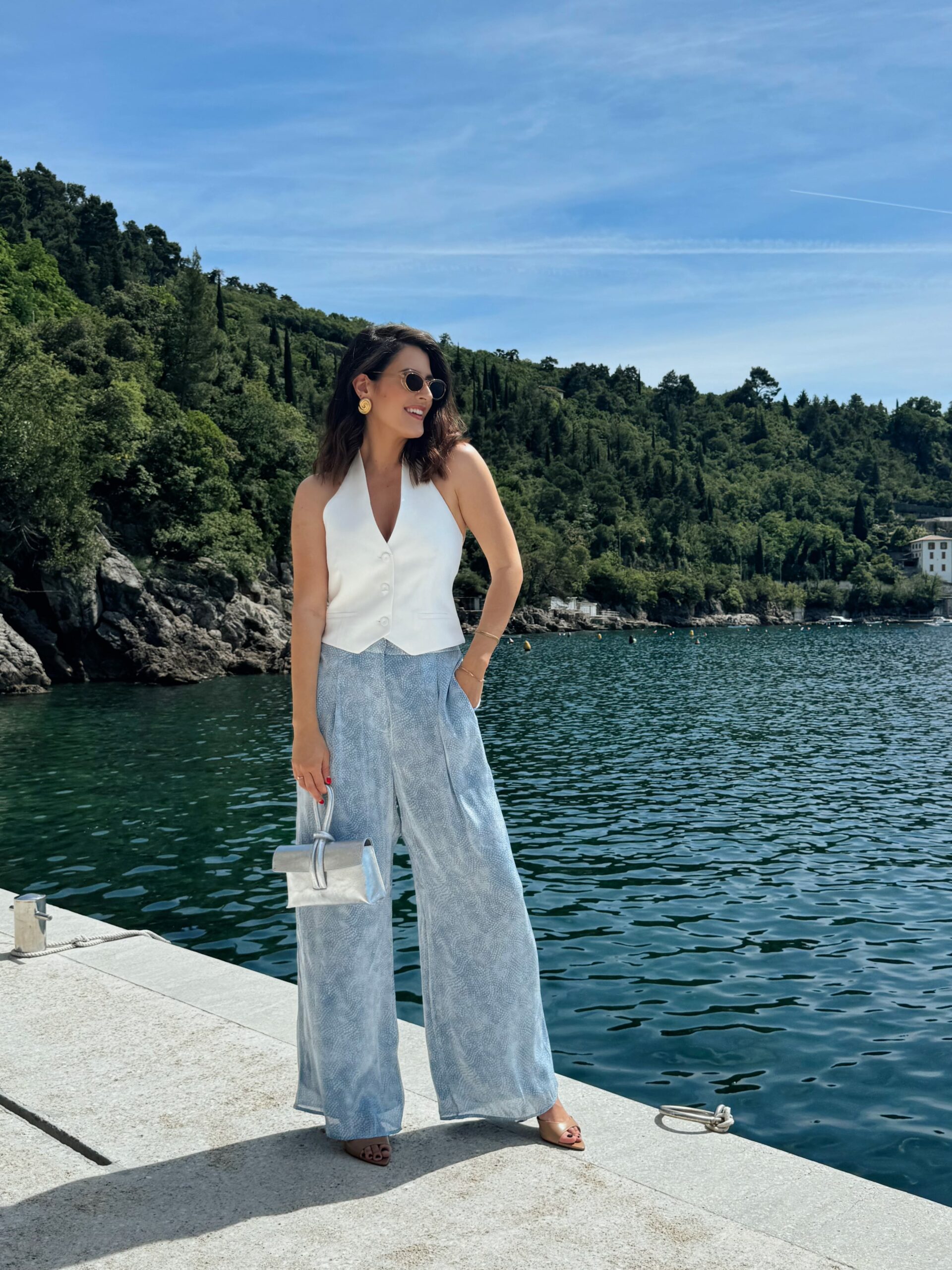 Osim njega, sigurnija opcija su lepršave hlače sa srebrnim detaljima te prsluk od odijela koji po ljeti možete nositi kao top.