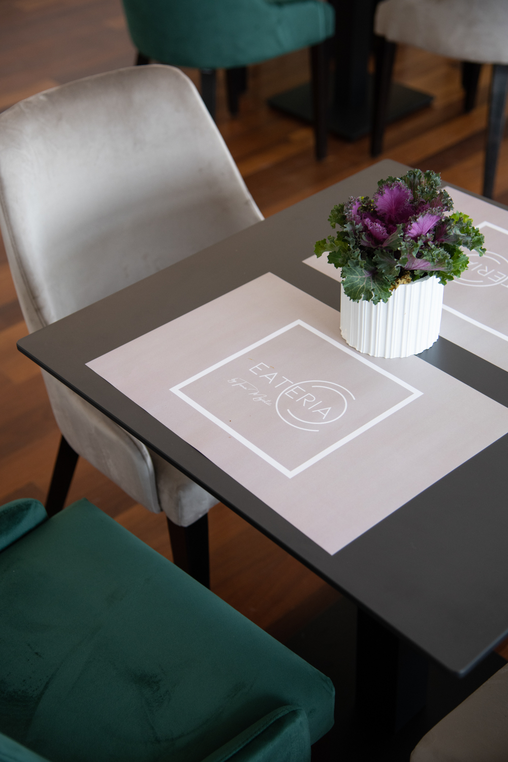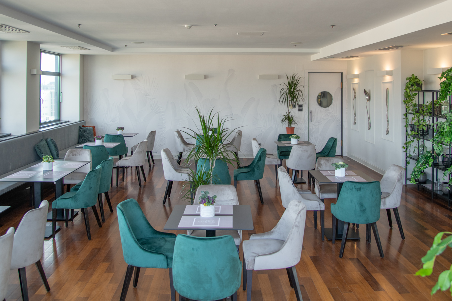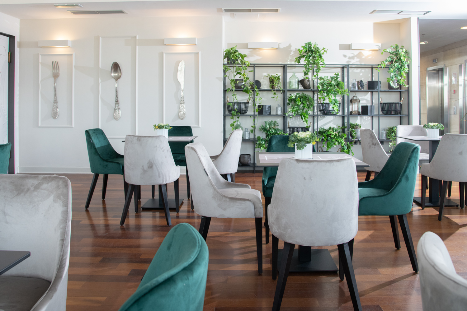 Bež i zelene nijanse savršeno se uklapaju uz elegantne sive stolove i zajedno tvore modernu cjelinu. Masivni pribor za jelo na bočnim zidovima simbolizira gastro čaroliju u koju smo stigli dok police u industrijskom stilu sa zelenilom različitih vrsta čine savršeni stilski spoj i odaju dojam prozračnosti.