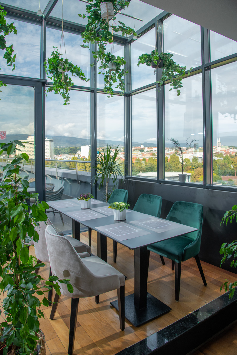 Uz vrhunsku ponudu domaće kuhinje, upravo je pogled ono što ovo mjesto čini posebnim. Prostrani ambijent okružen staklenim stijenama s kojih puca pogled na samo srce grada idealna je kulisa za doživljaj Zagreba u najljepšem svjetlu.