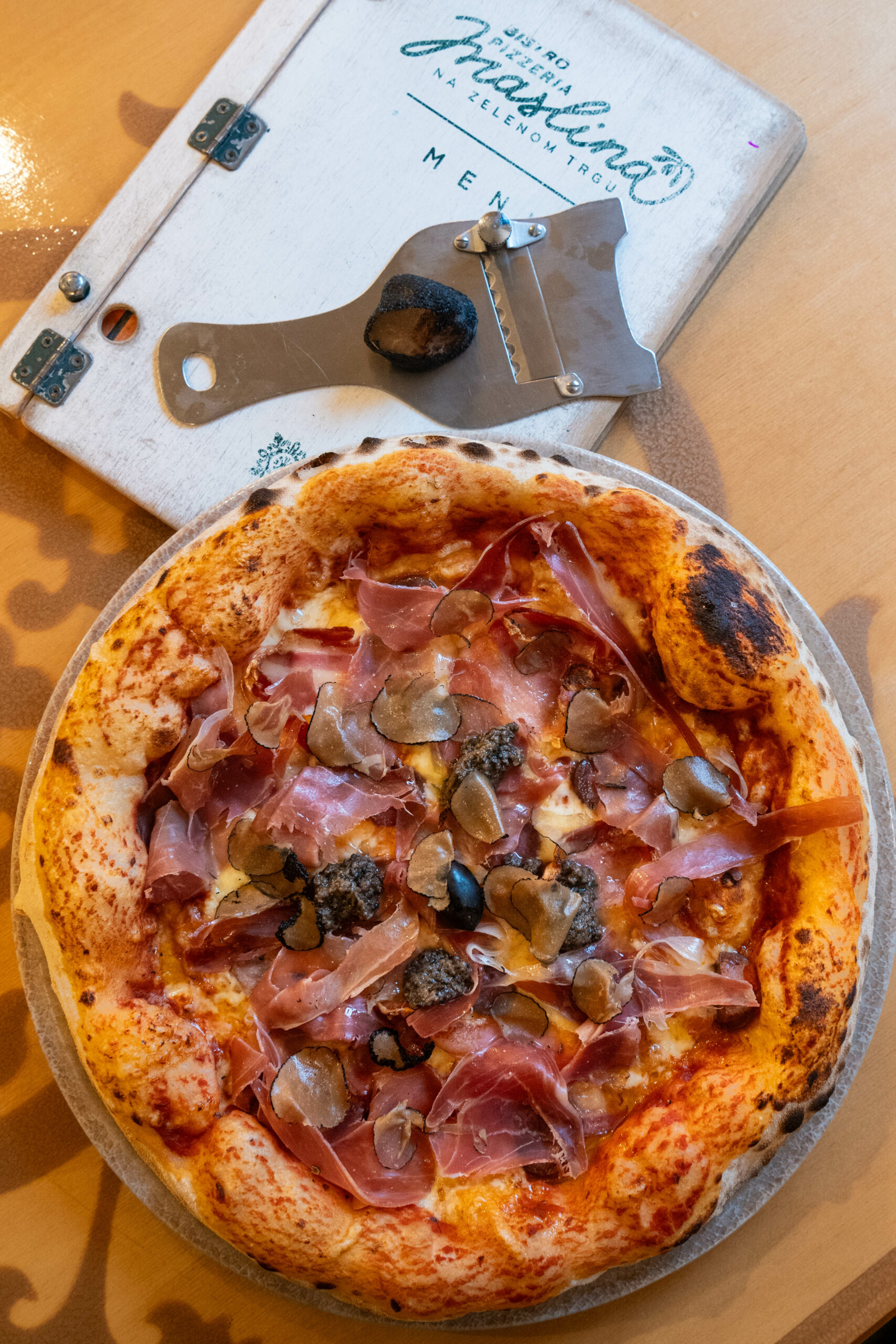 Za nas su u Maslini pripremili njihovu istoimenu pizzu, na kojoj se istaknulo nekoliko vrsta ukusnog mesa: pršuta, pancete i kobasice, te mirisni i svježe naribani tartufi.