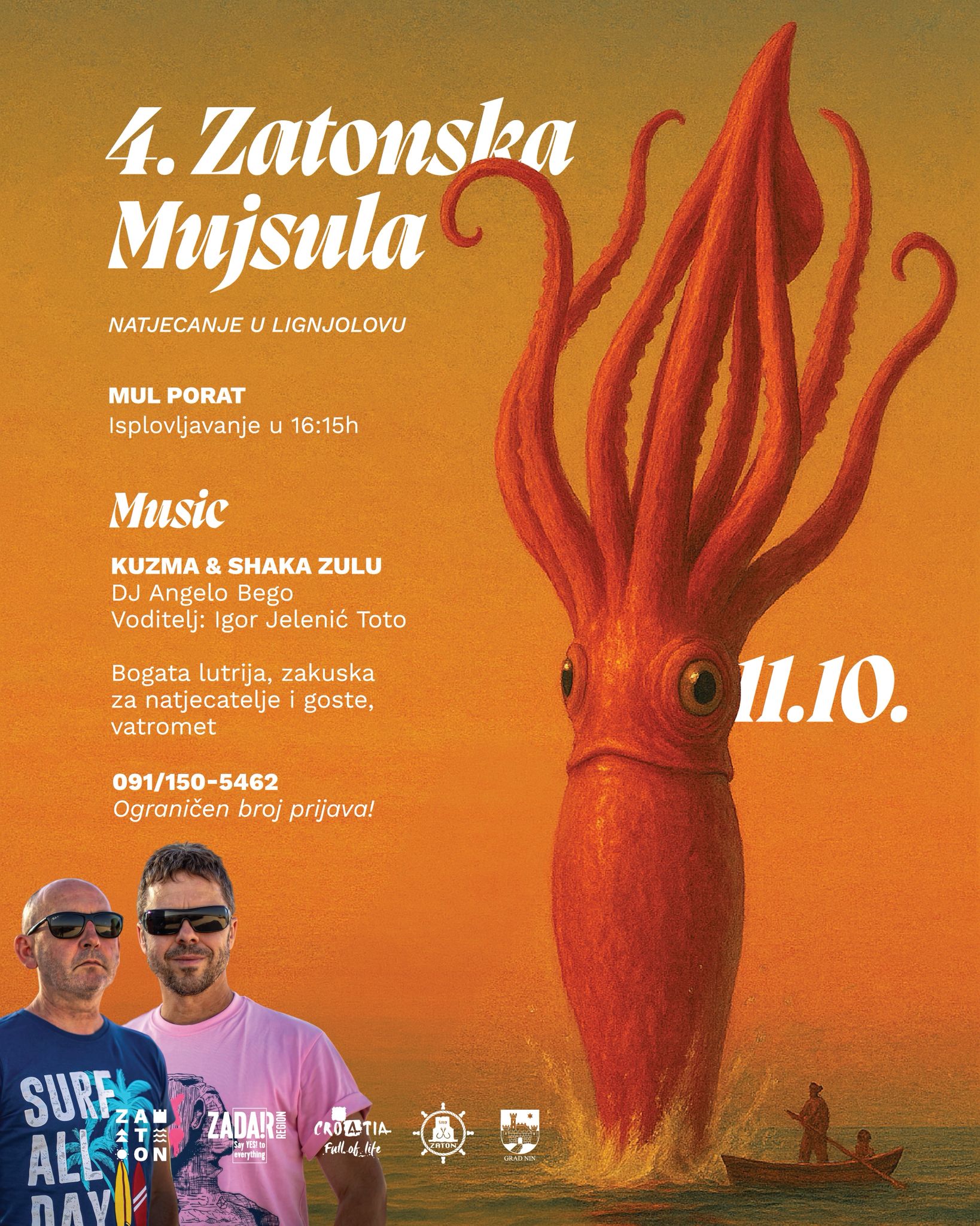A sve to počinje u subotu 11. listopada okupljanjem ispred zatonskog Mula kada će natjecatelji u 16:15 isploviti u potrazi za svojim najvećim lignjama.