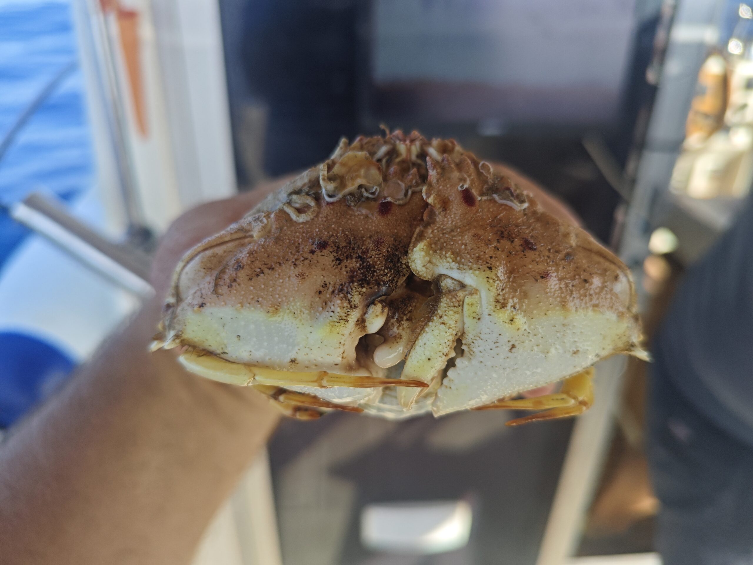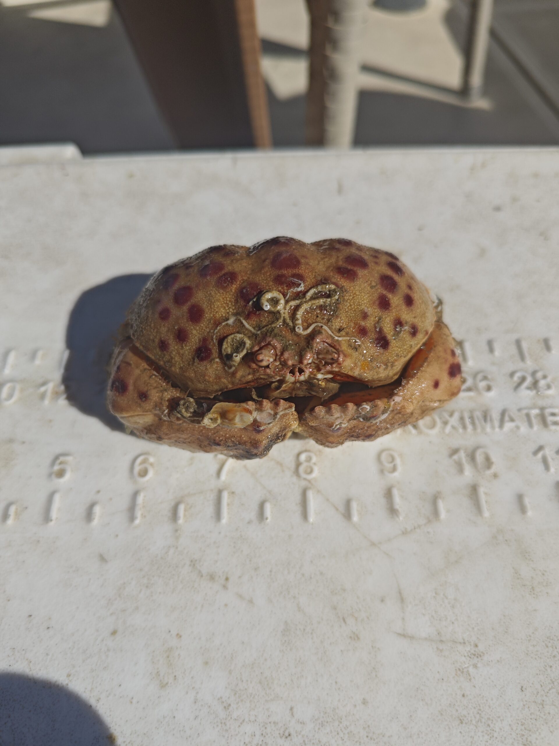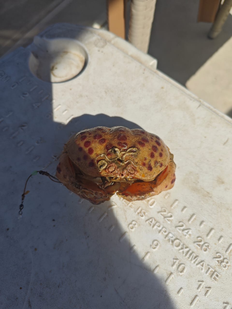 Loveći u akvatoriju Budvanske seke, na nekih 13 milja od obale, Zoran je ulovio crvenopjegavu rakovicu (Calappa granulata, Linnaeus, 1758).