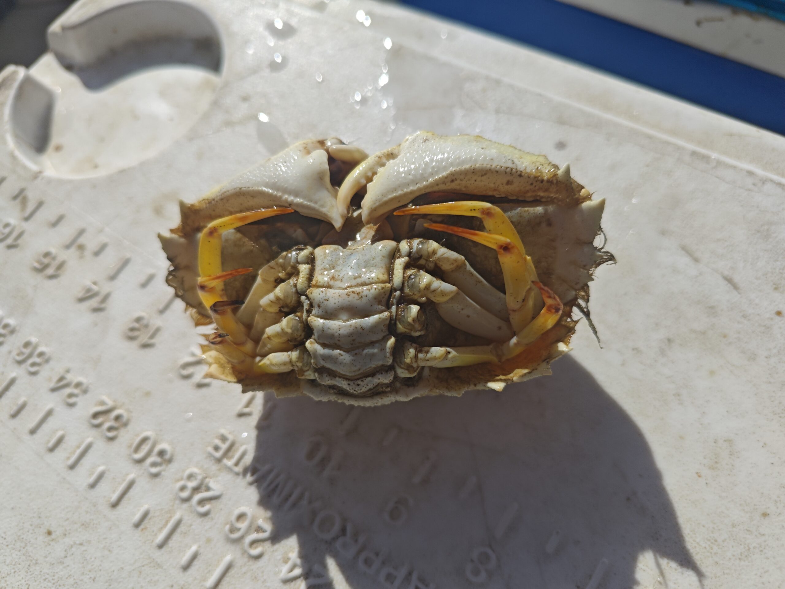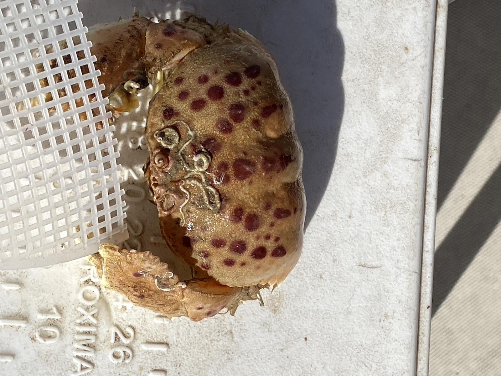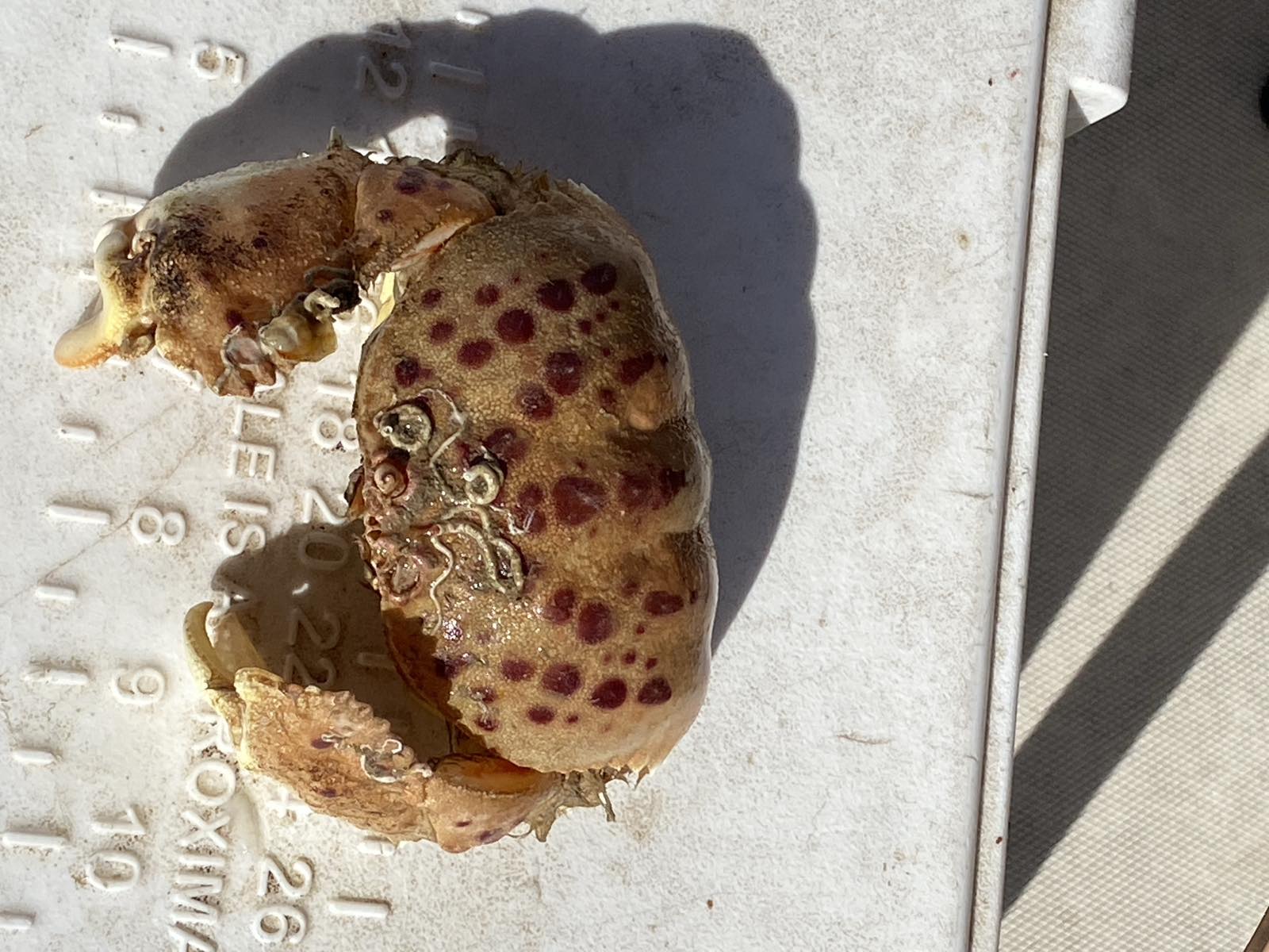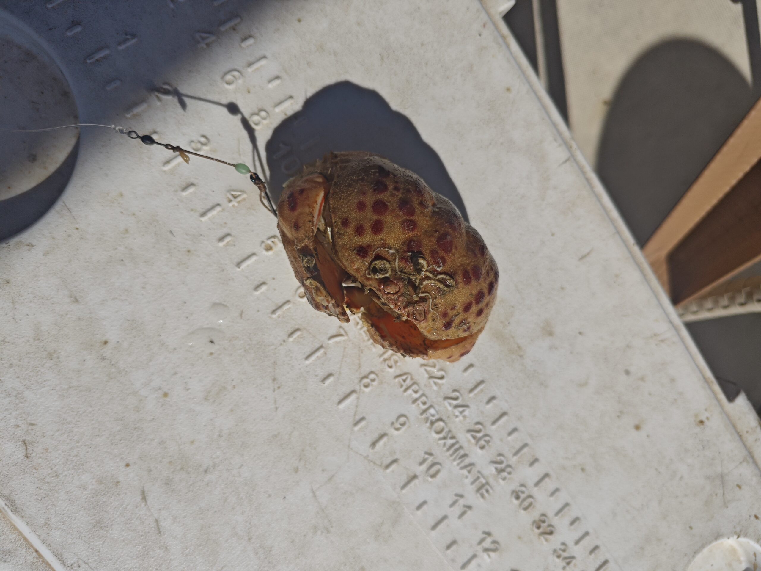 Loveći u akvatoriju Budvanske seke, na nekih 13 milja od obale, Zoran je ulovio crvenopjegavu rakovicu (Calappa granulata, Linnaeus, 1758).