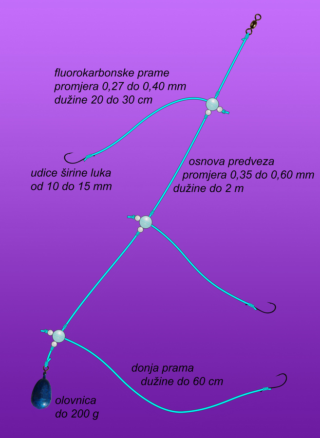 Takav je predvez idealno naoružati s tri prame od kojih je donja duga tridesetak centimetara, s osnovom predveza spojena neposredno iznad olovnice. Zahvaljujući ovako niskom vezu, prama će loviti ispod olovnice u tragu koji olovnica ostavlja prilikom povlačenja po dnu. Sljedeća prama duga 40 centimetara je vezana 60 centimetara iznad olovnice, a posljednja, duga 50 centimetara je vezana na 130 centimetara od olovnice. Spojni zogulin se nalazi 40 centimetara iza posljednje prame što znači da nam je kompletan predvez dug ravno dva metra. Ovako konstruiran predvez nakon zabacivanja, s dnom zatvara kut od nekih 30° pri čemu nakon zatezanja strune sve tri udice leže na dnu što je idealno za lov paukova, ovčica, arbuna, podlanica i ostalih vrsta prehranom i životnim navikama vezanima uz samo dno.