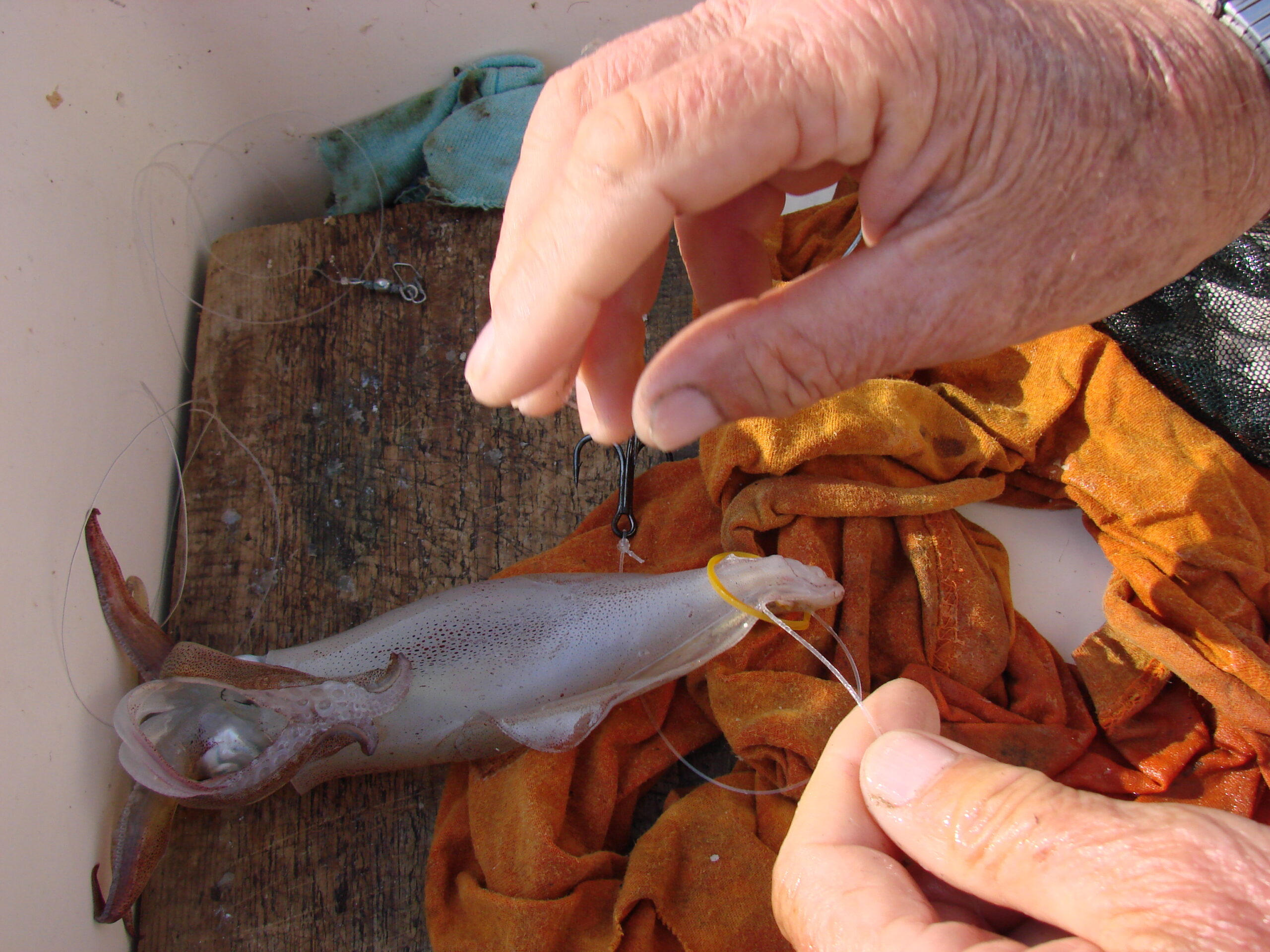 Pomoću kukice se provuče kroz sami vrh plašta lignje, te se kroz tako izvučeno ‘oko’ gumice provuče i cijela lignja.
