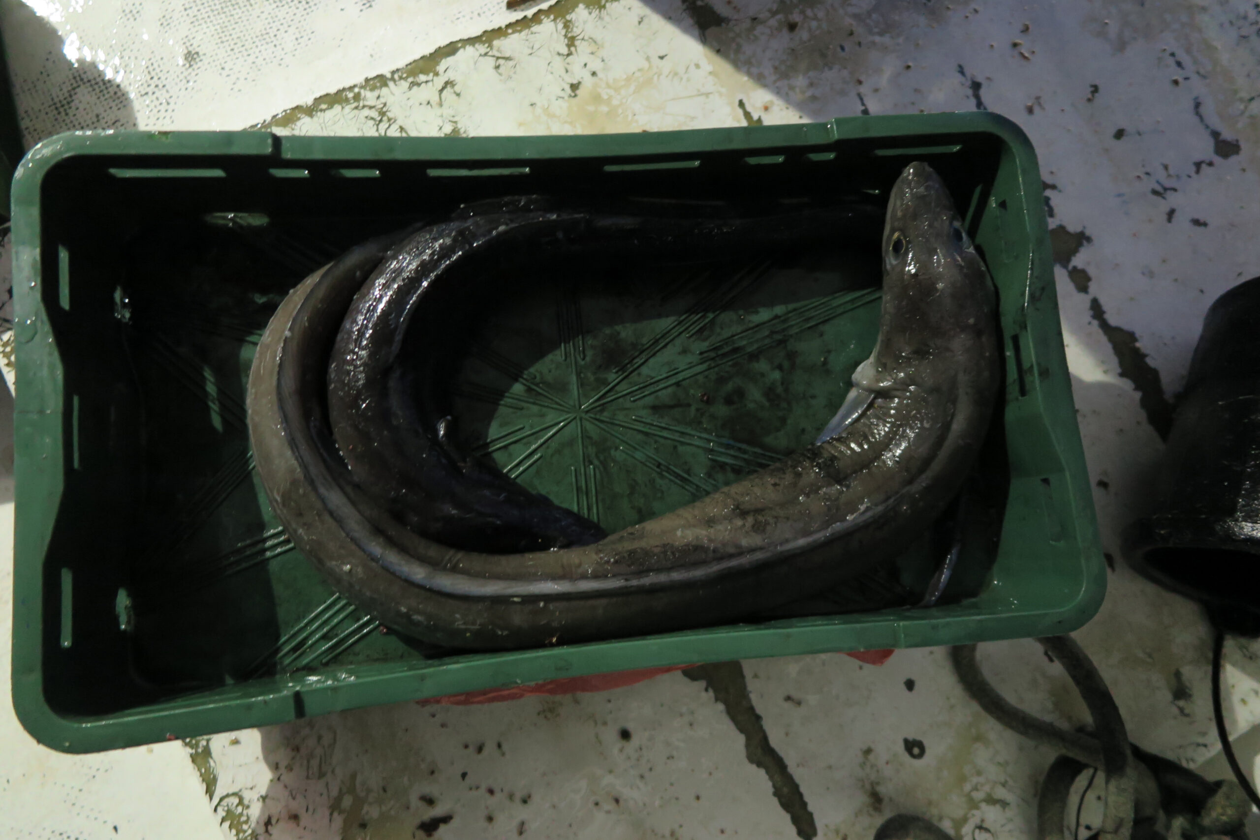 Kada se zakačeni ugor dovuče do obale, prihvat se obavlja podmetačem ili kod većih primjeraka kukom.