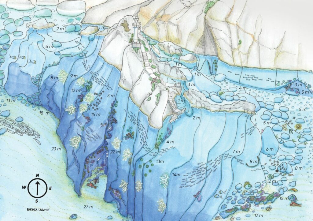 – Tamo gdje su plovni putovi i gdje je sve ravno, riba se neće ni zadržavati. Crtala sam karte na lokacijama koje su ipak bogatije životom. Na puntama gdje postoje izbočine, grebeni, prirodni zakloni, uvijek ima ribe. Na lokaciji Muntarol u Umagu stijene s dna vire kao neki kameni prsti, roniš i provlačiš se među njima. I sve je puno riblje mlađi. Gdje god ima stijena i procjepa koji služe kao zakloni, ima i riblje mlađi. Naši su plićaci zapravo riblja rodilišta, kaže Barbara.