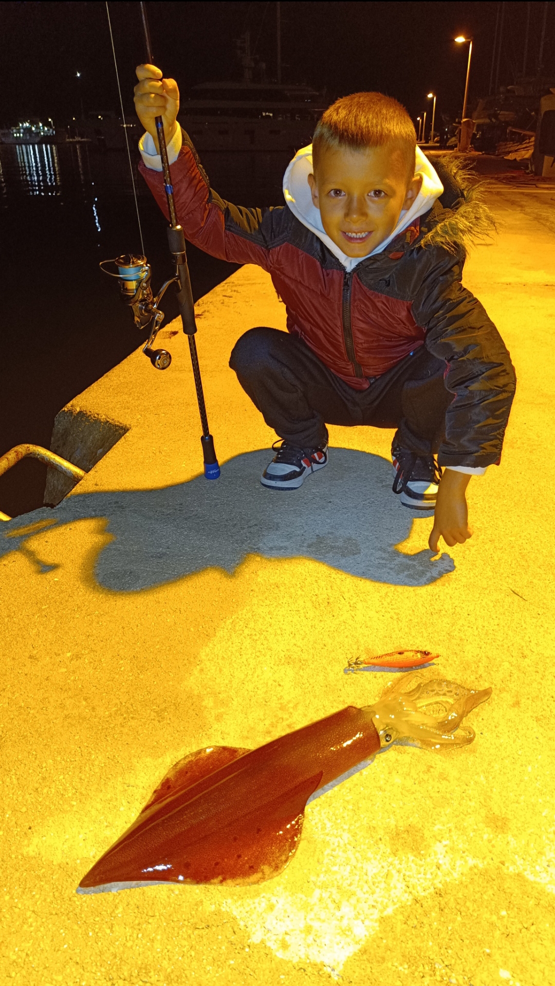 Nakon dvadesetak minuta osjetim da mi je nešto lagano povuklo i pustilo. E ovo je sigurno lignja. Brzo provjerim kočnicu jel dobro uštimana te lagano skosnem štapom. Odjednom rola prozuji, pumpa ona ka luda. Uf, ovo je prava! Meni noge već lagano klecaju, a srce lupa… Ajmeee!