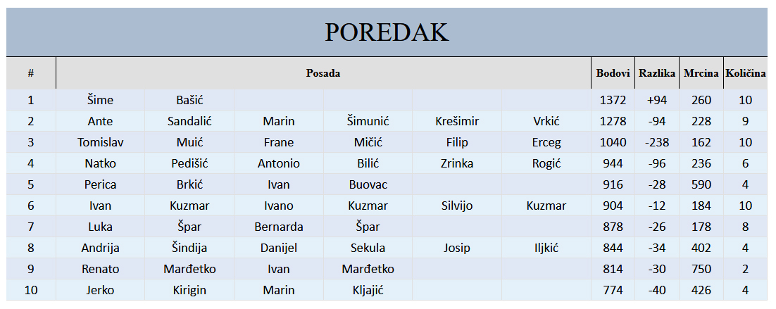 Drugo mjesto sa 178 grama ulovljenih liganja su osvojili Ante Sandalić, Marin Šimunić i Krešimir Vrkić, dok je prvo mjesto s 1372 grama ukupnog ulova osvojio Šime Bašić koji je nastupio sam, kao krnja ekipa, čime je njegov uspjeh tim veći.