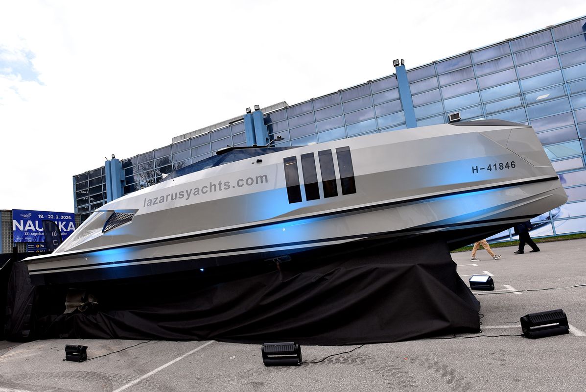 Sajam se otvara prijepodne, u deset sati. I prije deset u četvrtak se čekalo da prorade skeneri ulaznica pa da se uđe. Onako sastrane, da ne zna čovjek što se čeka, nalikovalo je sve na start kakve utrke. A odmah po ulasku neminovno je izvaditi mobitel i slikati vjerojatno najskuplje plovilo na sajmu, Lazarus 38.