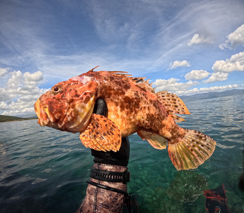 Nakon petnaestak neuspješnih zarona u prazno, na nekih 13 metara dubine ugledam ovu ljepoticu kako mirno leži u rupi. Nikad do tada nisam vidio toliku škarpinu, predivna riba. Palim kameru na glavi, nanišanim puškom i…