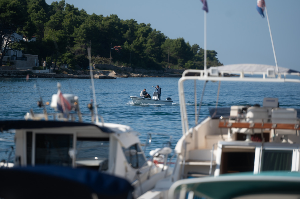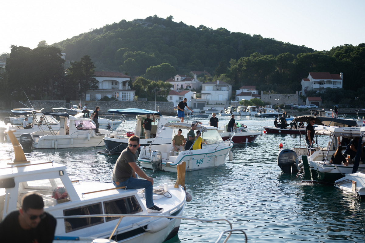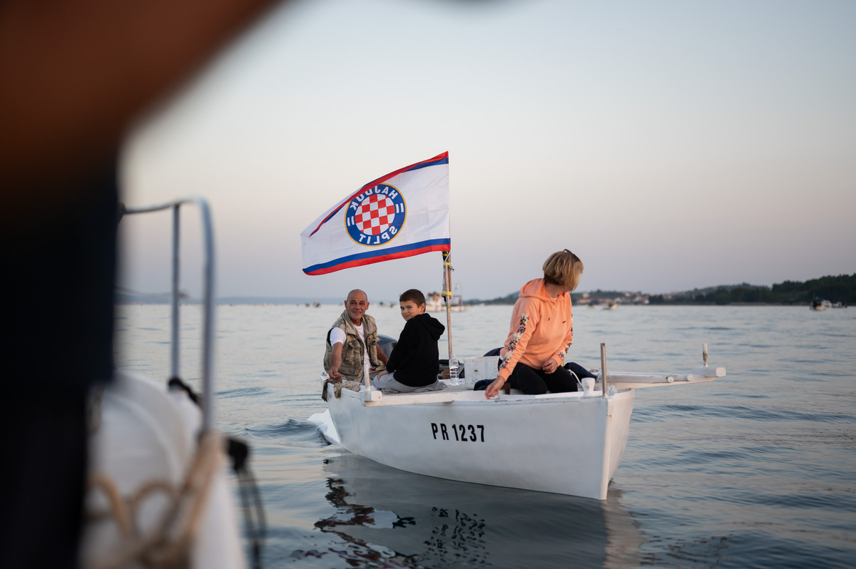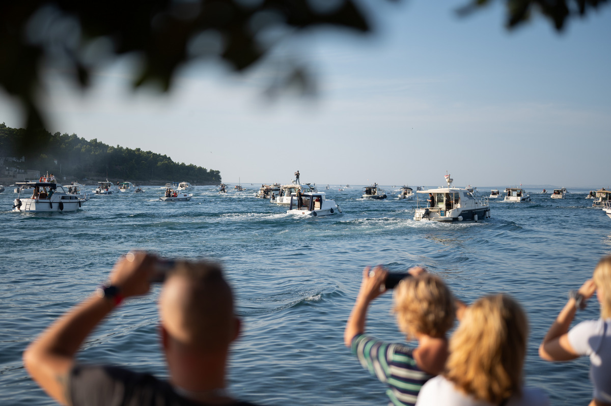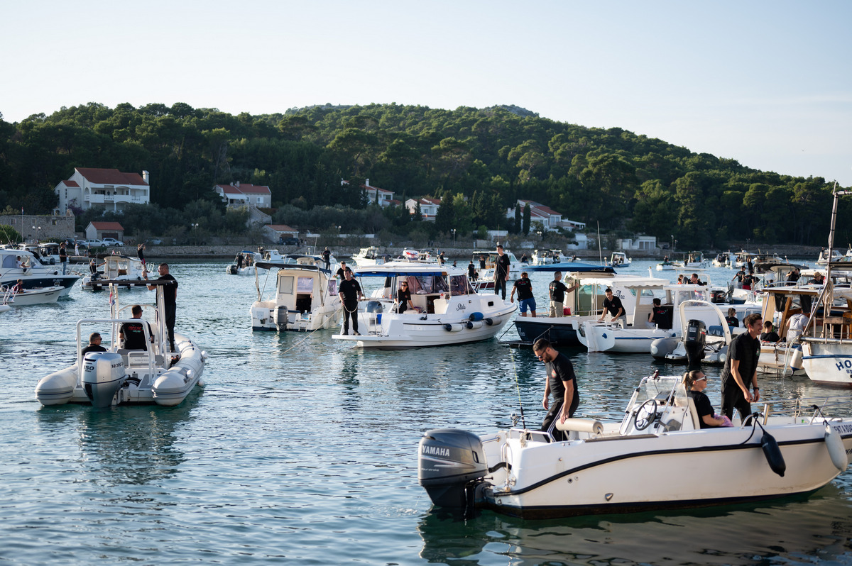 A onda se sve to odjednom prepolovilo jer je došao trenutak isplovljavanja. Brodice su se razvezale i zastale na liniji na rubu uvale čekajući da sudački brod oglasi signal za početak natjecanja u 16:30 sati.