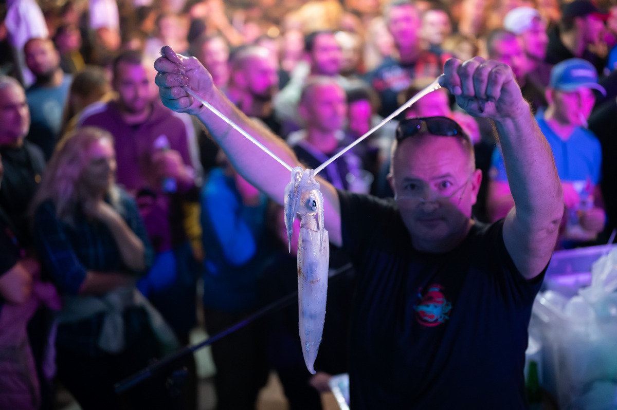 Vaganje je potrajalo nešto preko sat i pol vremena jer je svaki ulov bio u zavezanoj i električarskom vezicom osiguranoj najlon vrećici koju je najprije trebalo otvoriti, onda svaku lignju pogledati, izvagati i upisati. Svi prisutni su to mogli pratiti i preko velikog projektora na pozadinskom panou na kome se svakim novim unosom poredak na plasmanskoj listi mijenjao.