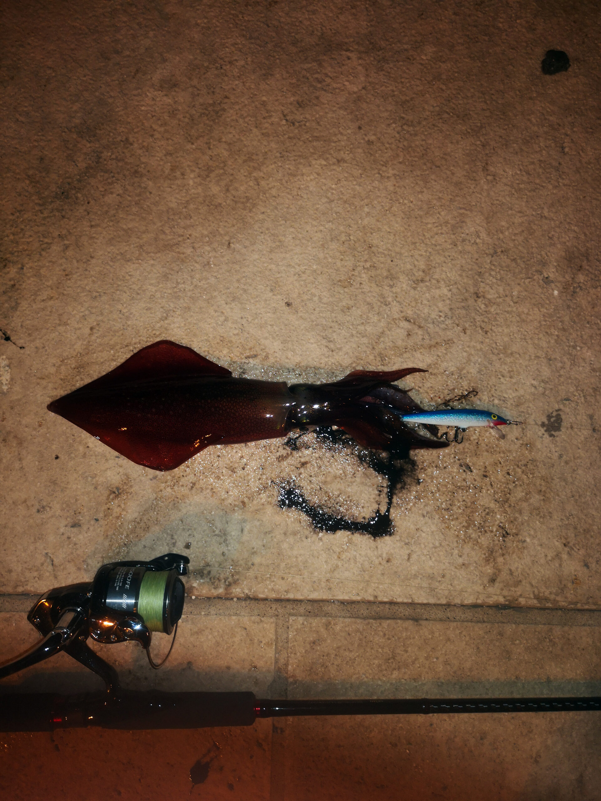 Oko 7 sati dobijem udarac, no nekako mi se činilo kao da sam zapeo za nešto. Na kraju se ispostavilo da je malo veća lignja primila Rapalinog Originala namijenjenog brancinu. A večer prije je bila ista situacija, samo s obale, gdje sam na istu varalicu loveći brancine ulovio 2 lignje…