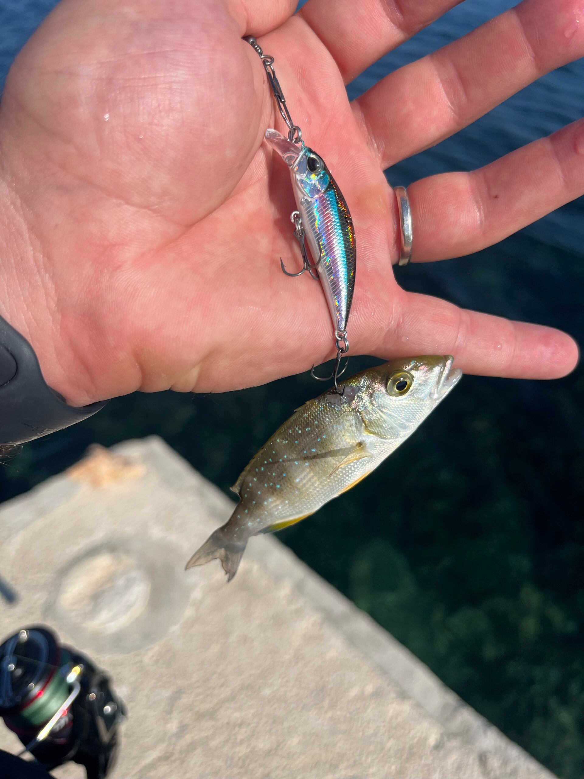 I u prvom zabacu osjećam udarac malog borca. Brzo ga izvlačim bez nepotrebnog mučenja i na brzinu klikam dvije kratke slike za frendove. To je najmanji zubo ikad uopće viđen s moje strane. Prekrasne plave pjege se presijavaju na suncu dok ga pažljivo oslobađam udice i vraćam u more...