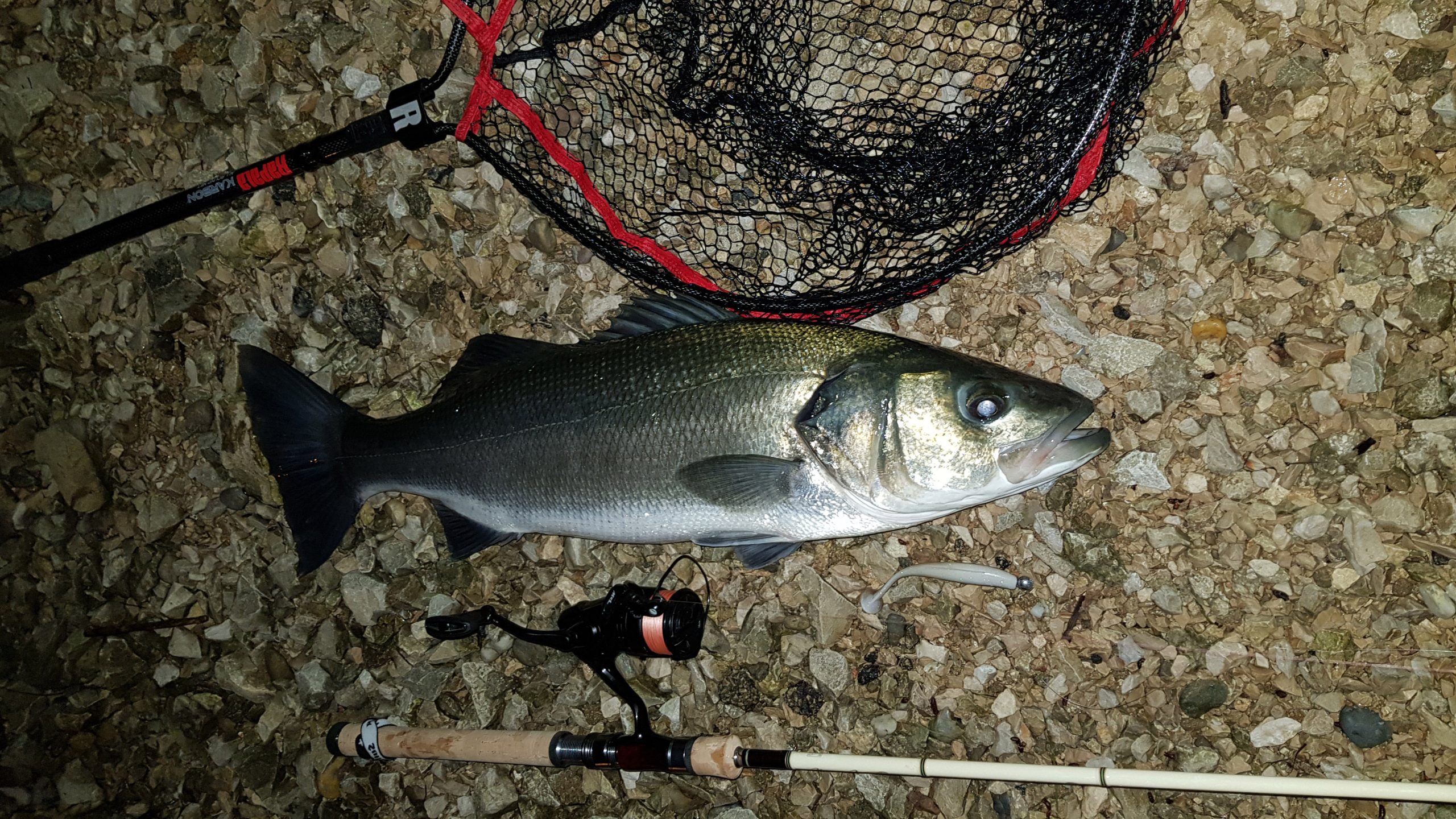 Štap je bio nabavljen za pastrvu, ali sam iskoristio priliku testirati ga na moru malo. Okačio sam provjerenog silikonca na jig glavicu od 5 grama i provukao ga na rubu svjetla uz sami betonski blok blizu dna. Brancin je izletio već u drugom zabačaju i pokupio varalicu gotovo pod nogama…