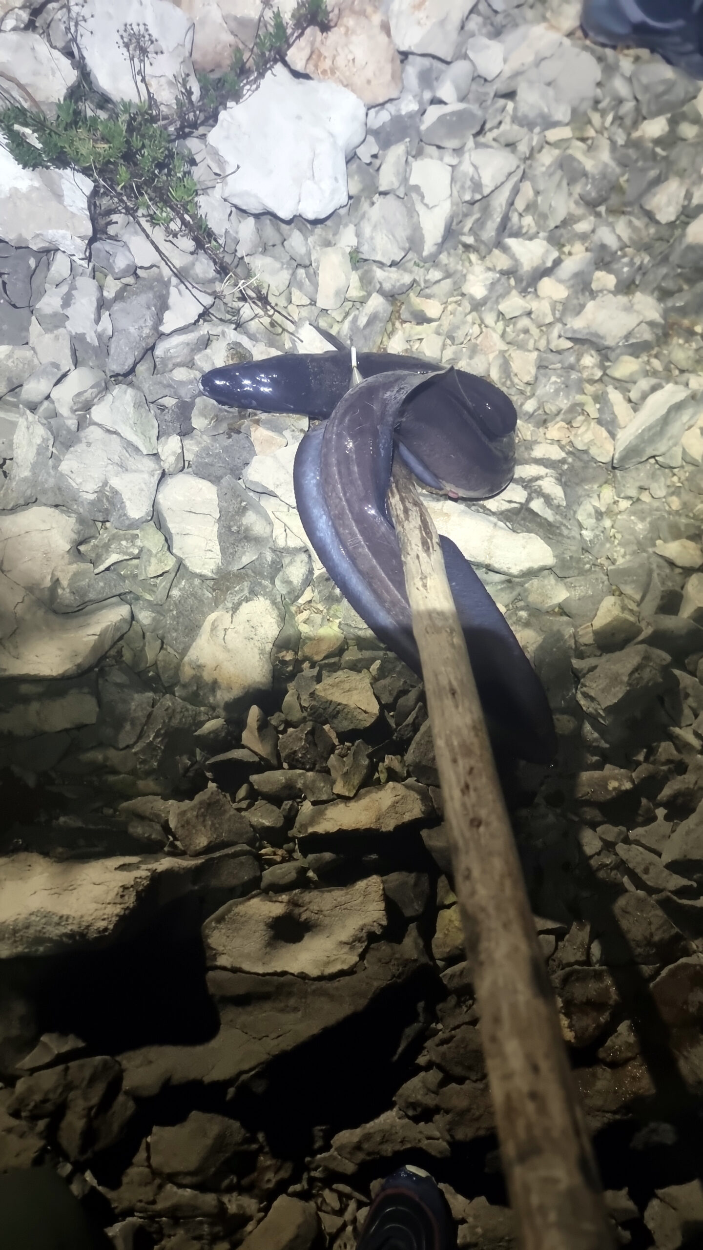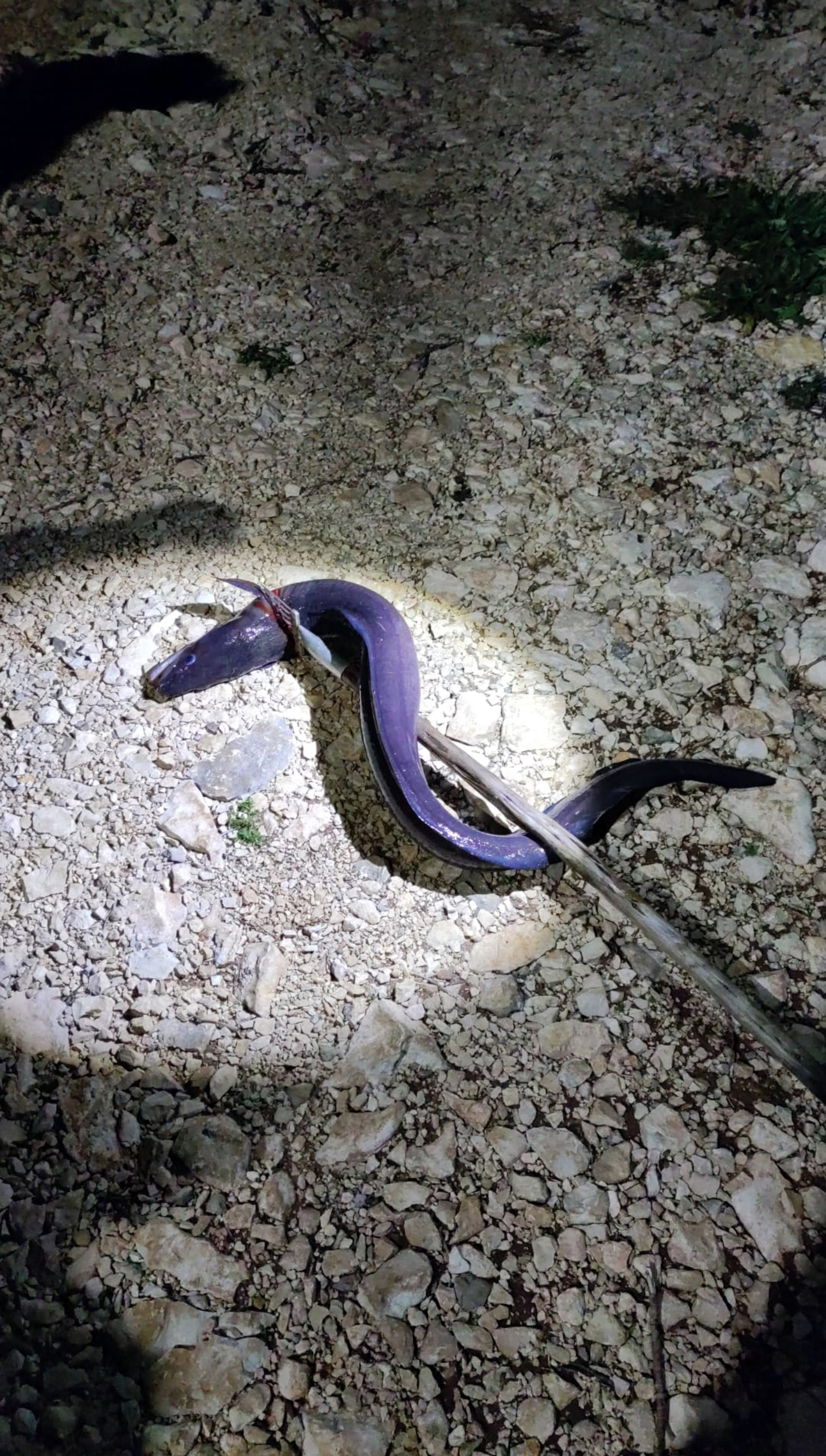 Bacam štap, bacam sve, i uzimam osti u ruke. Polako i mirno čekam da dođe što bliže meni da ga dobijem u što boljoj poziciji. Prišao mi je točno pod noge i kad je krenuo da se uvlači pod kamenja, ostima sam svom snagom zamahnuo i ubo ga točno u glavu...