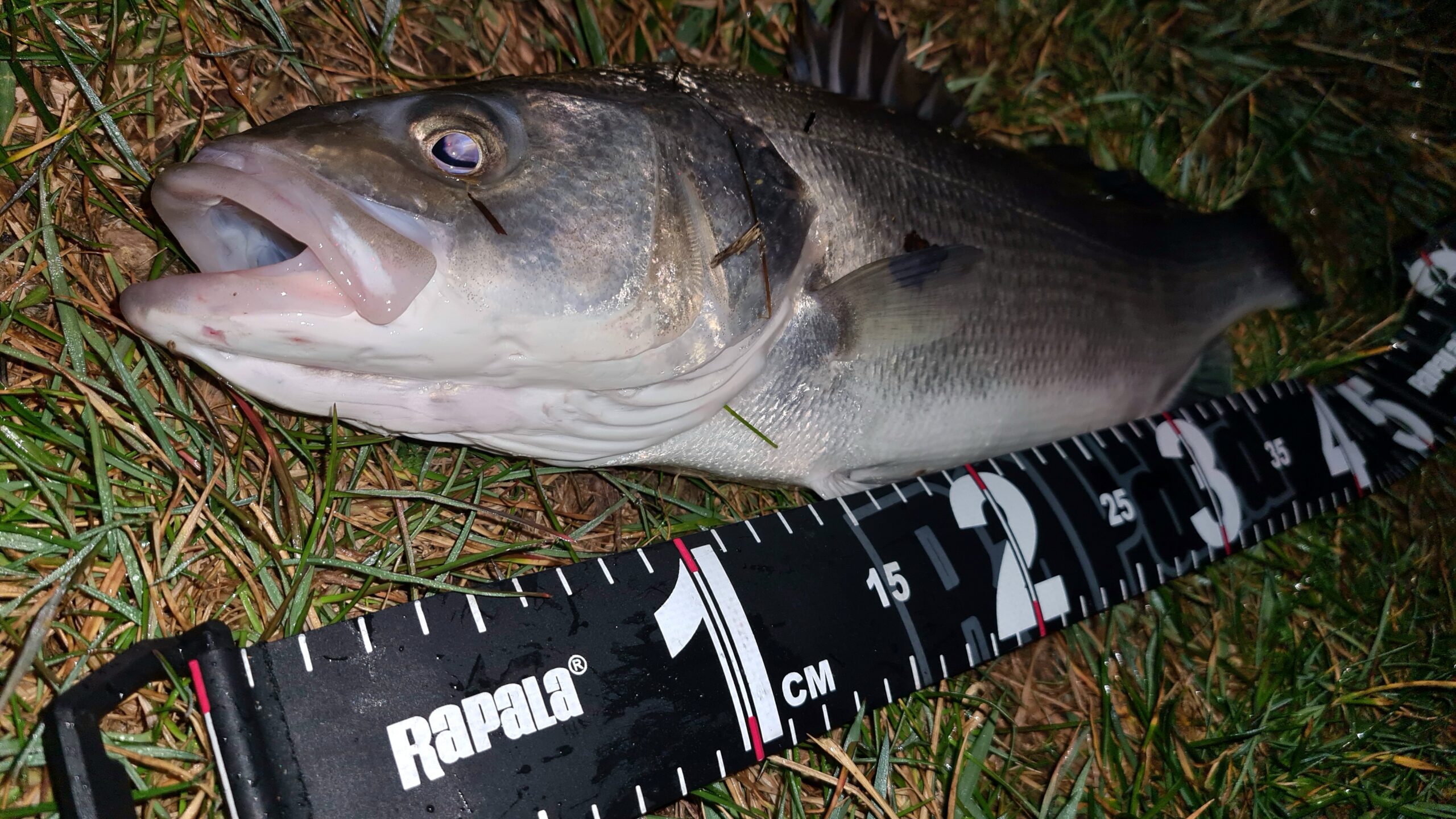 Odmah krećem s većim varalicama. Nema reakcije na 5″, spuštam se na bijelu Sakuru Slit Shad 4″ sa worm udicom i 3 grama otežanja. U svakom zabačaju mijenjam prezentaciju. Sporo povlačenje, twitch, srednje brzo povlačenje. I u 22:00 prvi udarac na srednje brzo povlačenje sa povremenim tvičanjem! Brza kontra i bez panike lagano privlačenje obali. Nakon dvadesetak sekundi se predao, ali tih par sekundi je dao sve od sebe. Izvlačenje na obalu, mjerenje 1,48 kilograma i cca 53 centimetra. Brza fotka i vraćanje u more.