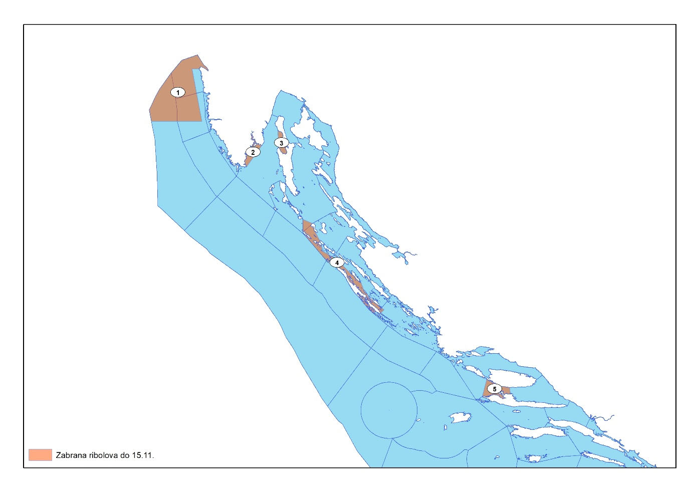 Zabranjeno je obavljanje ribolova u dijelovima ribolovnog mora označenim na karti, od 16. listopada 2025. godine do 15. studenoga 2025. godine u 12.00 sati: