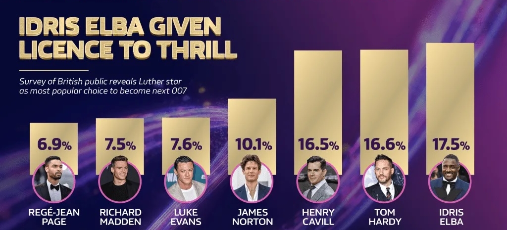U anketi u kojoj je sudjelovalo 3500 Britanaca, najviše glasova je dobio glumac s čijim se imenom u početku dosta kalkuliralo, ali koji je u međuvremenu nestao s radara jer se ne uklapa u okvire kriterija producenata. Riječ je o Idrisu Elbi kojeg kao novog Jamesa Bonda želi vidjeti 17,5 posto ispitanih, a slijedi još jedan stari favorit koji također ne odgovara traženom profilu, Tom Hardy s 16,6 posto podrške. Naime, Elba će za dva tjedna navršiti 51 godinu, Tom Hardy je također rođen u rujnu, samo pet godina ranije, ali ni on s 46 godina na plećima ne dolazi u obzir.
