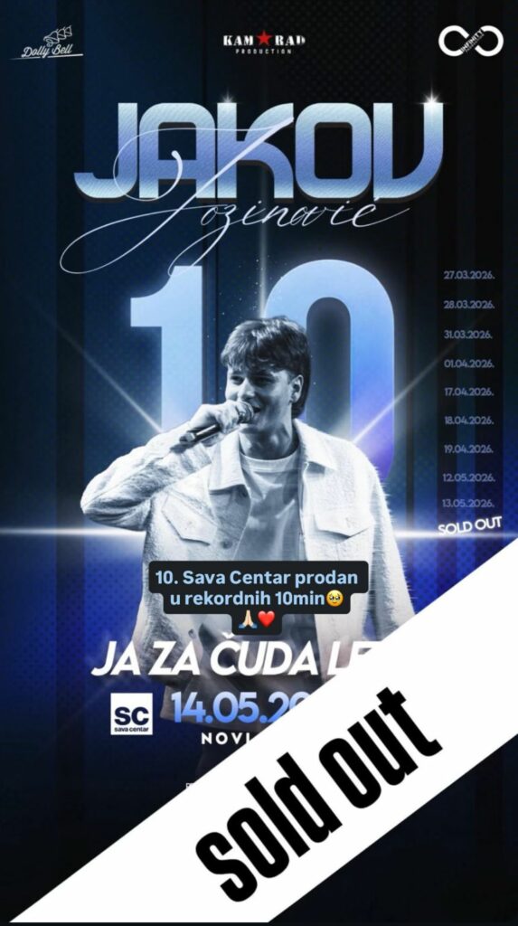 Regionalna glazbena atrakcija, mladi Vinkovčanin Jakov Jozinović objavio je danas kako je rasprodao i deseti uzastopni koncert u beogradskom Sava Centru. On je na rasporedu 14, svibnja, a datum je dodan nakon što je jučer u samo 20 minuta rasprodan deveti koncert, za koji je u redu čekalo preko devet tisuća zainteresiranih.