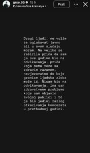 ,,Dragi ljudi, ne volim se oglašavat’ javno, ali u ovom slučaju moram. Naveliko se raširila priča da sam ja ove godine bio na odvikavanju, priča koja nema veze sa zdravim razumom, nevjerovatno do koje granice ljudska zloba može ići”, započeo je u objavi putem Instagram priče.