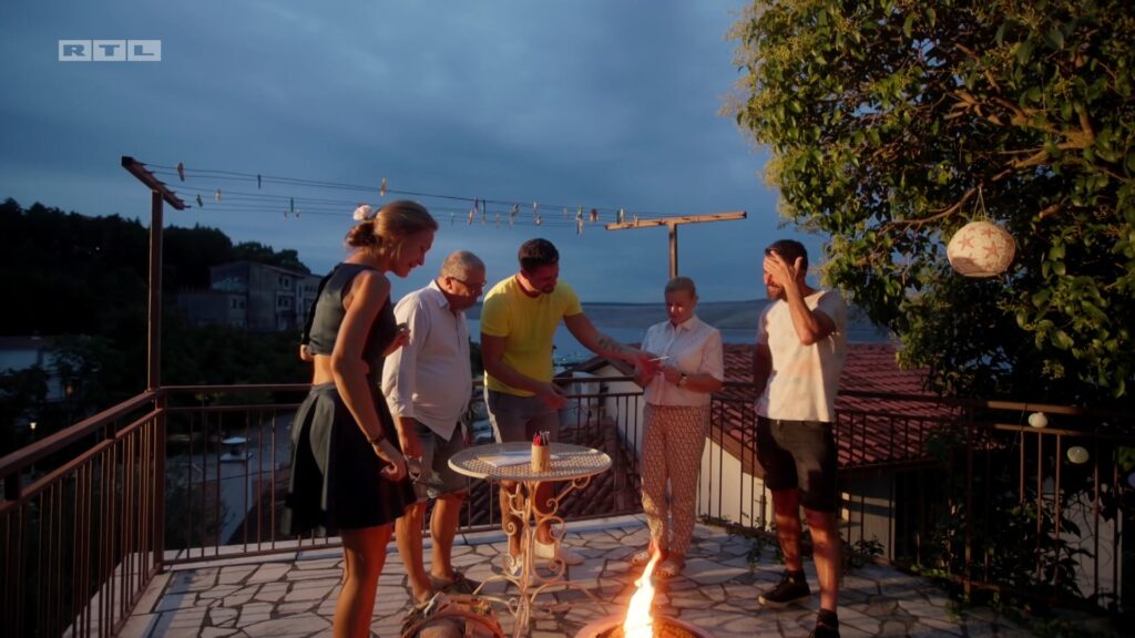 Tijekom večere, Olga je organizirala ekipi i “paljenje njihovih mana”, a dotad je spravila glavno jelo do kraja. Prije glavnog jela, pala je i kiša pa je Olga premjestila ekipu u kuću. “Olga u kuhinji izgleda neiskusno”, komentirao je Vladimir. “Losos mi je jedna od najdražih riba. Bio je odličan, a riža onako”, ocijenio je glavno jelo, pak, Sebastian. “Kad sam vidjela svoj tanjur, bilo mi ga je malo previše. Malo je masno, ne mogu reći da mi se nije svidjelo, ali nije mi bilo ni nešto posebno”, komentirala je Gordana.