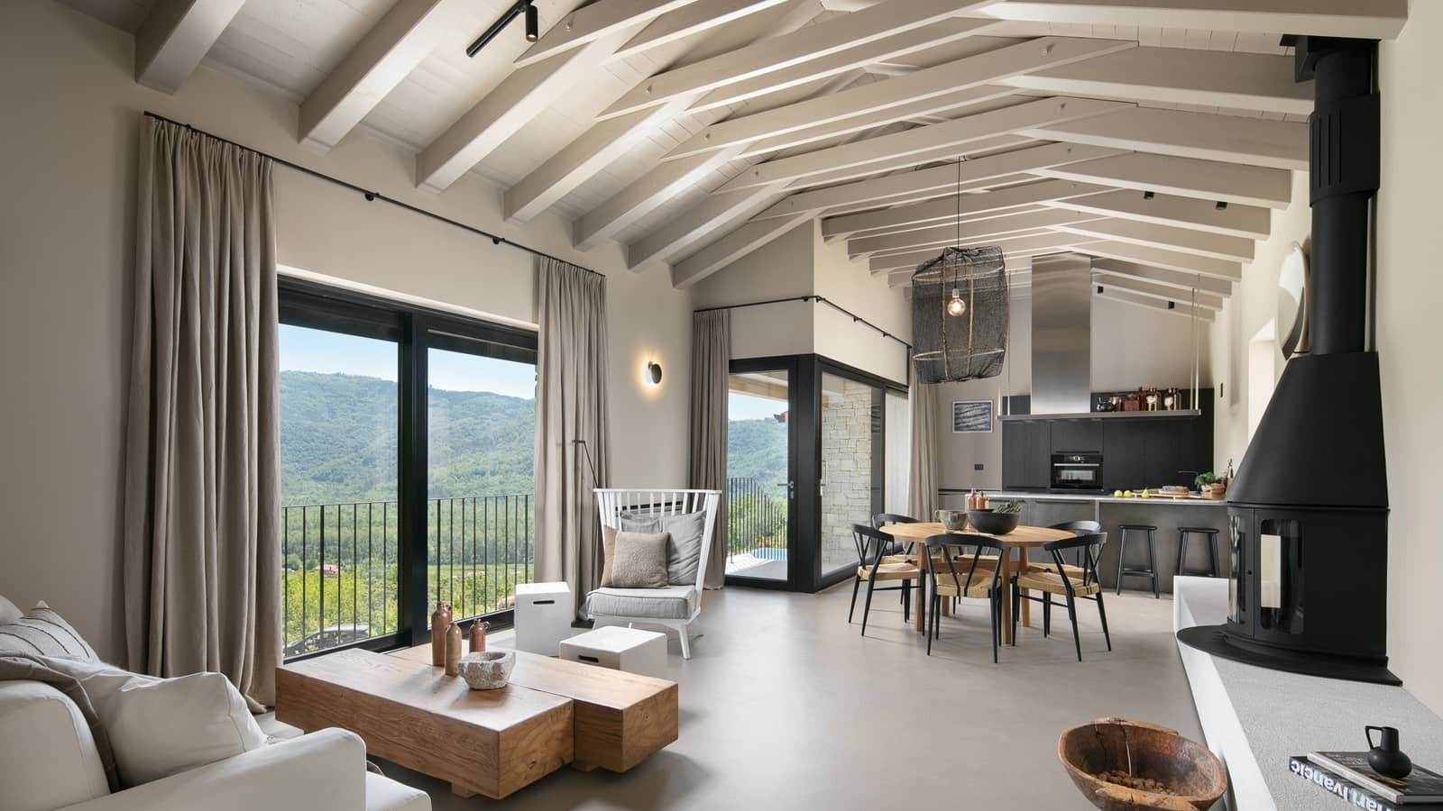 Veliki, integralni prostor koji uključuje kuhinju, blagovaonicu i dnevni boravak, izrazito visokog stropa, a iza njih – zatvoreni bazen! S kauča u bazen, mogli bismo definirati ovi priču koja ide u red uistinu rijetkih na području čitave Hrvatske, bilo priobalne ili kontinentalne.