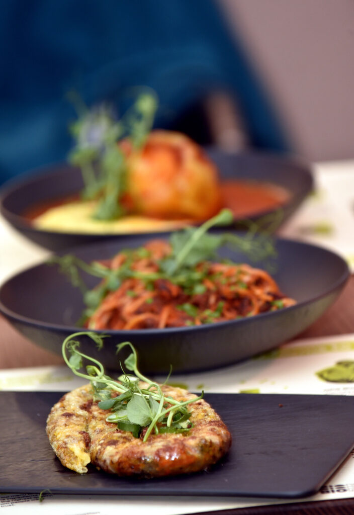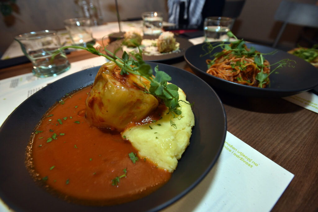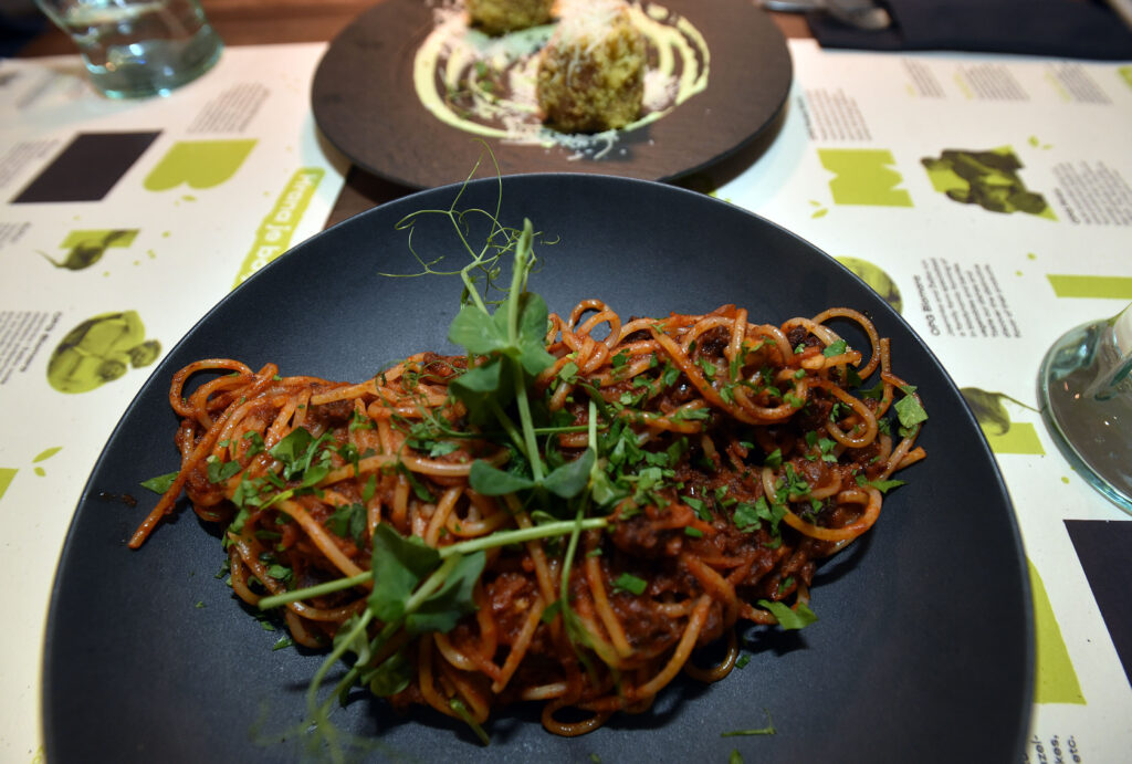 Zaista, tamnozeleni ambijent restorana, ukrašen biljkama i šarenim slikama i nama je stvarao ugodu te smo se osjetili i više nego dobrodošlima u BioManiji. Ovaj susret nije mogao proći bez da isprobamo svu tu posebnu hranu o kojoj smo toliko čuli pa je Dario odabrao neka od najpopularnijih jela restorana, kao što su BioMania burek i, novi na meniju, arancini s gljivama i veganskim sirom, ali i jela koja je možda najneobičnije naći u veganskom restoranu – spaghetti bolognese i sezonsku punjenu papriku.